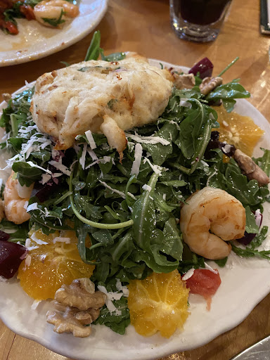Other entrees ordered by our table included linguini and meatballs, ricotta mac and cheese, steak and shrimp, and something called a fazzioletti crepe. The meatballs were large, underseasoned, and had the texture of a well-done hamburger. The mac and cheese suffered from the same congealed fate as my pizza -- it should have been hotter. The steak and shrimp was a perfectly acceptable dish, like something you might have been served at a Connecticut country club in the 1950s. I did not sample the crepe, but it came with a side of Swiss chard as did several of the other entrees, which everyone said was "tough." Now, how a cooked leafy-green vegetable can be rendered tough is a mystery to me, but there you are.