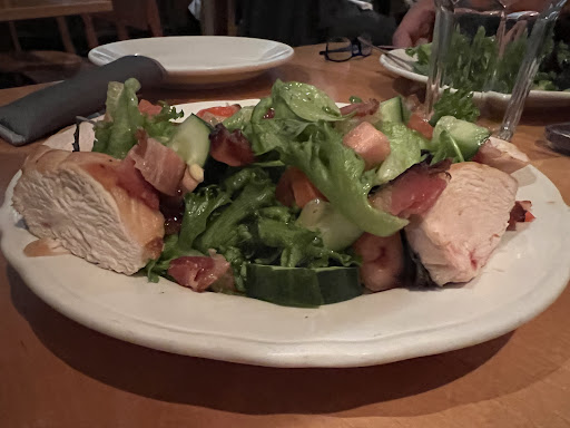 But what about the food? It was okay, but not as good as I remembered from my first visit. The restaurant boasts of its woodfired pizzas, so that's what I had -- a fairly conventional order of a pie with red sauce and mozzarella topped with sausage and mushrooms. The pies are just big enough for two to share, although if you're really hungry, a whole pie to yourself would not be too much. The sauce and cheese were generously applied and the toppings were of good quality, but the crust -- thin, dry, cracker-like -- was not to my taste. I prefer something a little thicker, a little breadier, a little chewier -- i.e., New York style, which these pizzas are not. And it was served lukewarm so that the cheese was no longer gooey and stringy but had begun to congeal. Too bad. I also ordered a Caesar salad on the side, which turned out to be torn leaves of romaine lettuce tossed with a creamy ranch-like dressing and little crouton cubes that might have come out of a bag from Stop and Shop. Not bad, but lacking anchovies, not really a Caesar salad either.