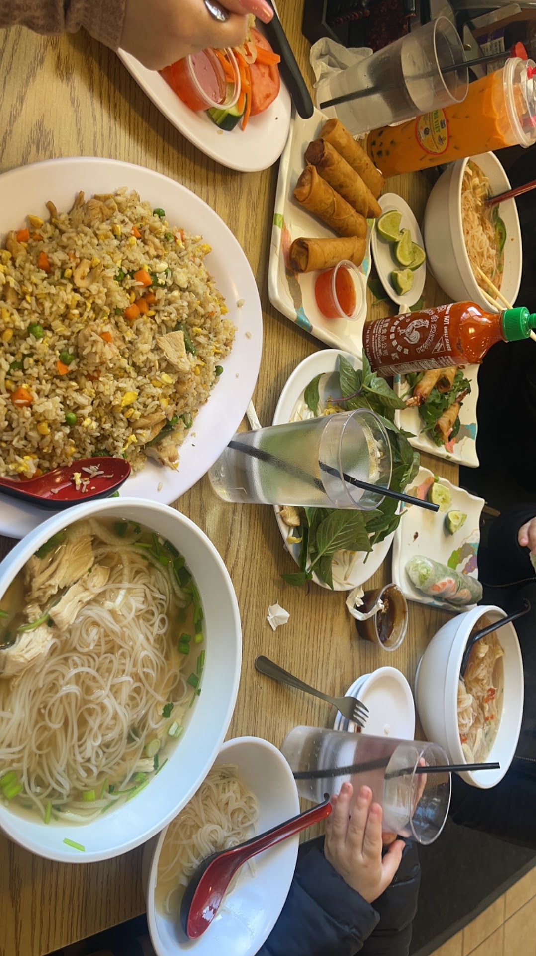 Read moreLove their pho so much and have yet to find a better pho place but our past two experiences were extremely gross. As you can see we ordered plenty of food here this day! My fried rice had pieces of guy hair, most of our waters had floaties inside and the cups were still dirty, and all the spoons looked like they were washed in a hurry. We couldn’t finish our food because we ended up getting grossed out so we got our tabs and they didn’t tell us 15% tip was already included in each of our two item tabs. Not even a whole group on one check, which would be understandable. When I paid with card, got my receipt that says how much tip I desire to leave, I asked the lady working at cashier if the tip was already included, to make sure of the amount of tip I was going to leave and kid you not, she said it wasn’t! Good thing my cousin next to me still had her check (not paid yet) and it showed her tip was included in her check, meaning that mine was too. I then approached the lady once again and explained that she had lied to me and said it wasn’t. She then proceeded to give me my receipt back to change the tip amount. Will not be going back since every experience we’ve had here was bad. Saddened because their pho is...