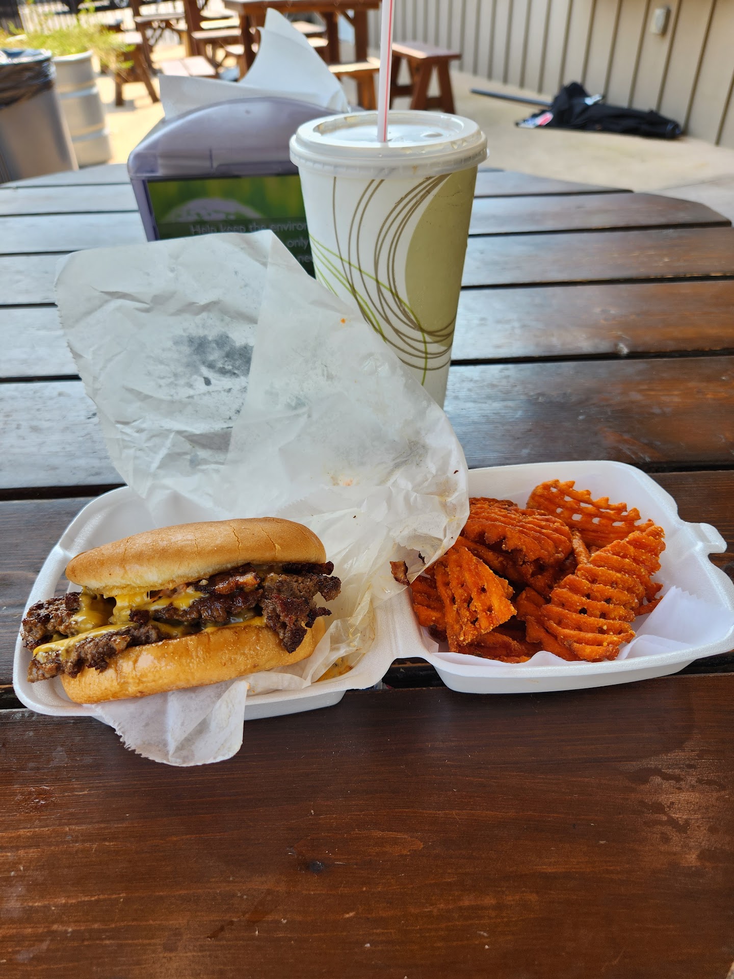 Read moreI was visiting a friend in Greenfield and I picked this restaurant because we wanted to try something new. I wanted the pulled pork because I saw it on the online menu. But they had run out for the day. So I had to order something else. Our order was very simple. We got two single burgers, fries and a coleslaw. When I ordered my burger I didn't ask for any changes. I did ask about the mug sauce and what it tasted like. The cashier described it to me. And it sounded good. My daughter ordered extra lettuce on hers. The place was very busy. When you finally got our food we sat down outside and realized that our burgers had nothing on them but lettuce. No sauce, onion or tomato. So then we had to go back in and wait to get a side of these toppings. They were cold and so it brought the temp down on the burger. And the burgers were already getting cold because they had to sit there while we got the missing items. I didn't want to have to assemble it myself. It should have come out warm and made right. Honestly, it was very bland even with the sauce. The burger meat had no flavor. The crinkle fries were average. The coleslaw was not good. We didn't even eat but one bite. It was bitter and had too much vinegar. I will give this place another try and hope that they have what I really wanted originally. It's conveniently located to the park so I know in the summer it's going to...