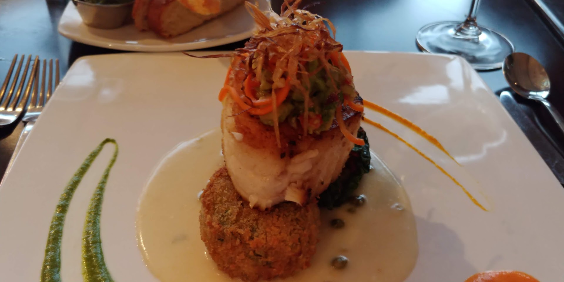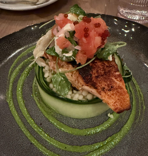 I had the sea bass, which was fantastic. Cooked perfectly. My wife ordered the salmon, and I was especially impressed with the plating (picture attached.) It was served on Israeli couscous that closely resembled salmon roe. Whether that was intentional or not, it was a fun and clever visual detail that I appreciated.