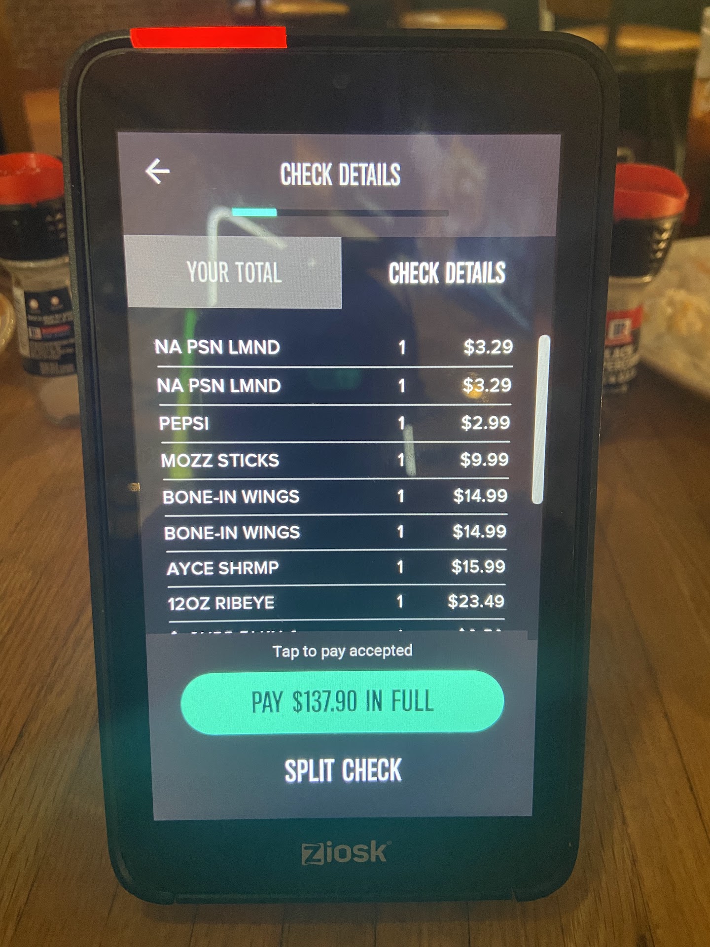 We were able to place our order with here quickly. We ordered traditional wings, mozzarella sticks, and boneless wings as an appetizer. Then, we ordered Our drinks came right away. All food items were served hot and delicious making it an enjoyable meal. Our waitress, Bre, continued to check on use to ensure that we were good and did not need anything.
