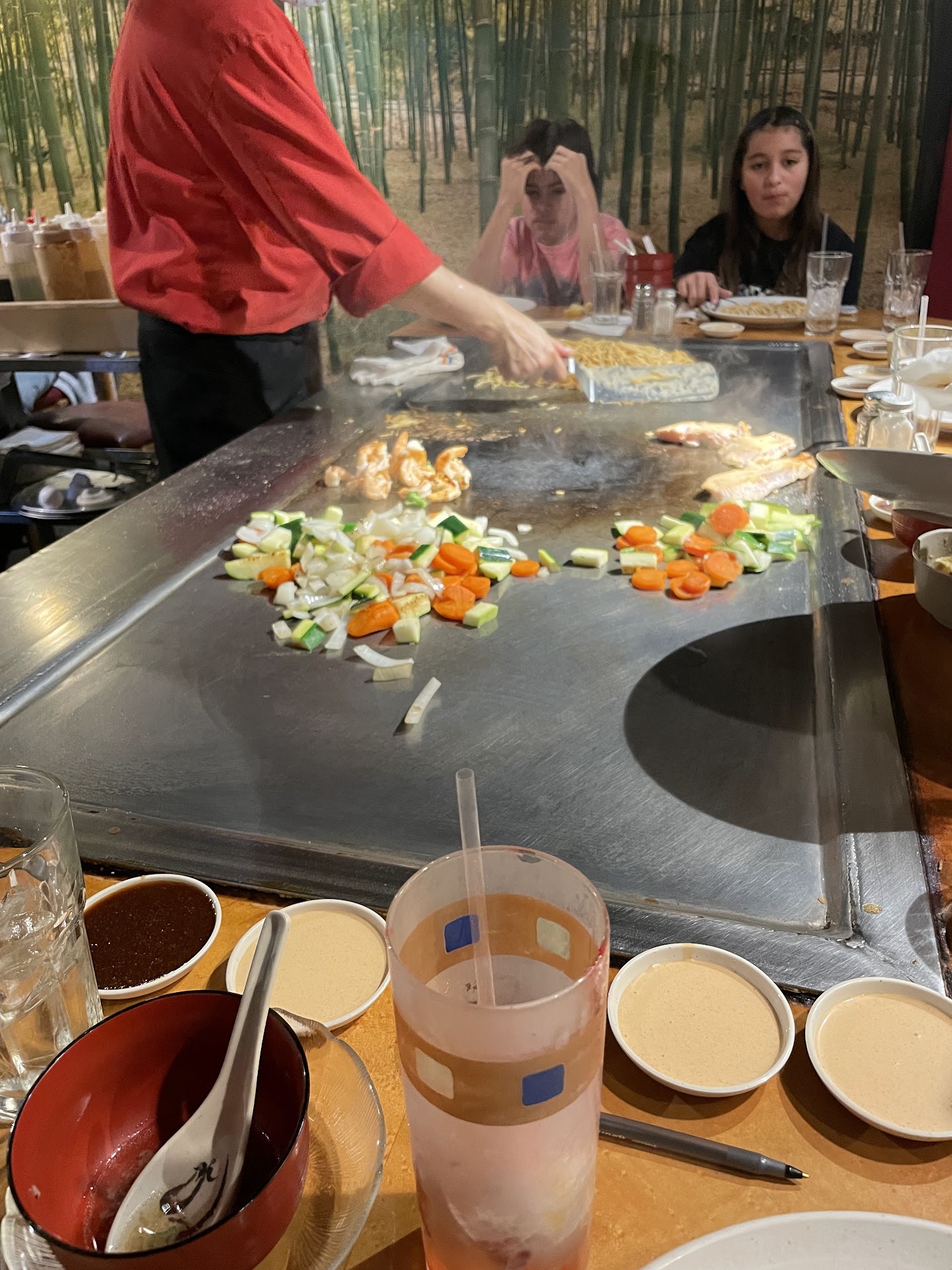 The hibachi chefs here are all super nice and funny, constantly making people laugh or smile while doing their cooking entertainment. The waitresses are fast to get everything needed and cleaned up, and they're super sweet and understanding!