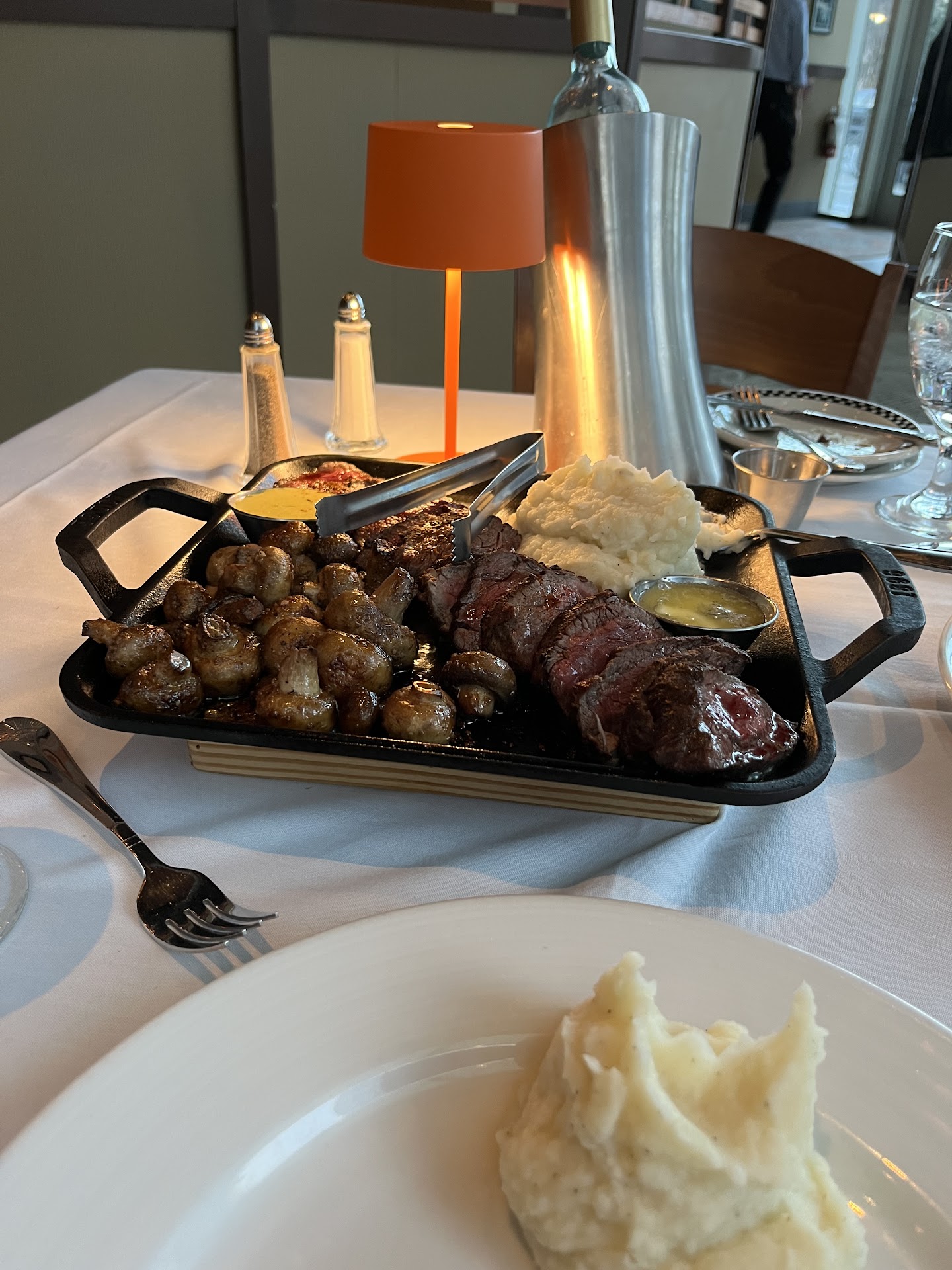 Read moreWe dined here Saturday evening. Our reservation was for 5pm. The hostess was friendly and seated us promptly. Our dining table was well appointed with white linens and a small, yet eclectic, orange lamp that provided the perfect ambient lighting for a romantic dinner. The music was soft and relaxing. It was perfect for a date night with the person you love. The floor to ceiling windows made us feel like we were part of the buzzing city on the other side of the glass. As we sat down a gentleman brought us a plate of pickles and olives that were bursting with flavor. Our waitress was friendly, polite and very respectful. She filled our water glasses and brought us a basket of warm bread that was crispy on the outside and soft on the inside that paired perfectly with the olives. Since this was our first time dining at B. Christopher's she patiently answered all of our questions. The wine list was extensive, but we finally settled on the Barone Fini Pinot Grigio 2020. We were not disappointed. For our main course we decided on the Chateaubriand for two. Our sides were garlic mashed potatoes and braised mushrooms. We chose bearnaise and Maitre d'butter for our steak sauces. Our waitress came by with a selection of steak knives for us to each choose from. The presentation of our meal was like nothing we had been served before. We ordered our steak medium and I specifically asked for no drippy blood. Guess what?? No drippy blood!!! The meat was melt in your mouth tender and so robust with flavor that the sauces weren't necessary, but who can refuse a good bearnaise sauce? And B. Christopher's bearnaise sauce accents the meat so well that I couldn't even stop myself from finishing it!!! We finished our sensational meal with a warm apple tart topped with salted caramel ice cream. From the moment we walked in the door until the moment we walked out the door B. Christopher's was impeccable. We will come back to Greensboro just to...