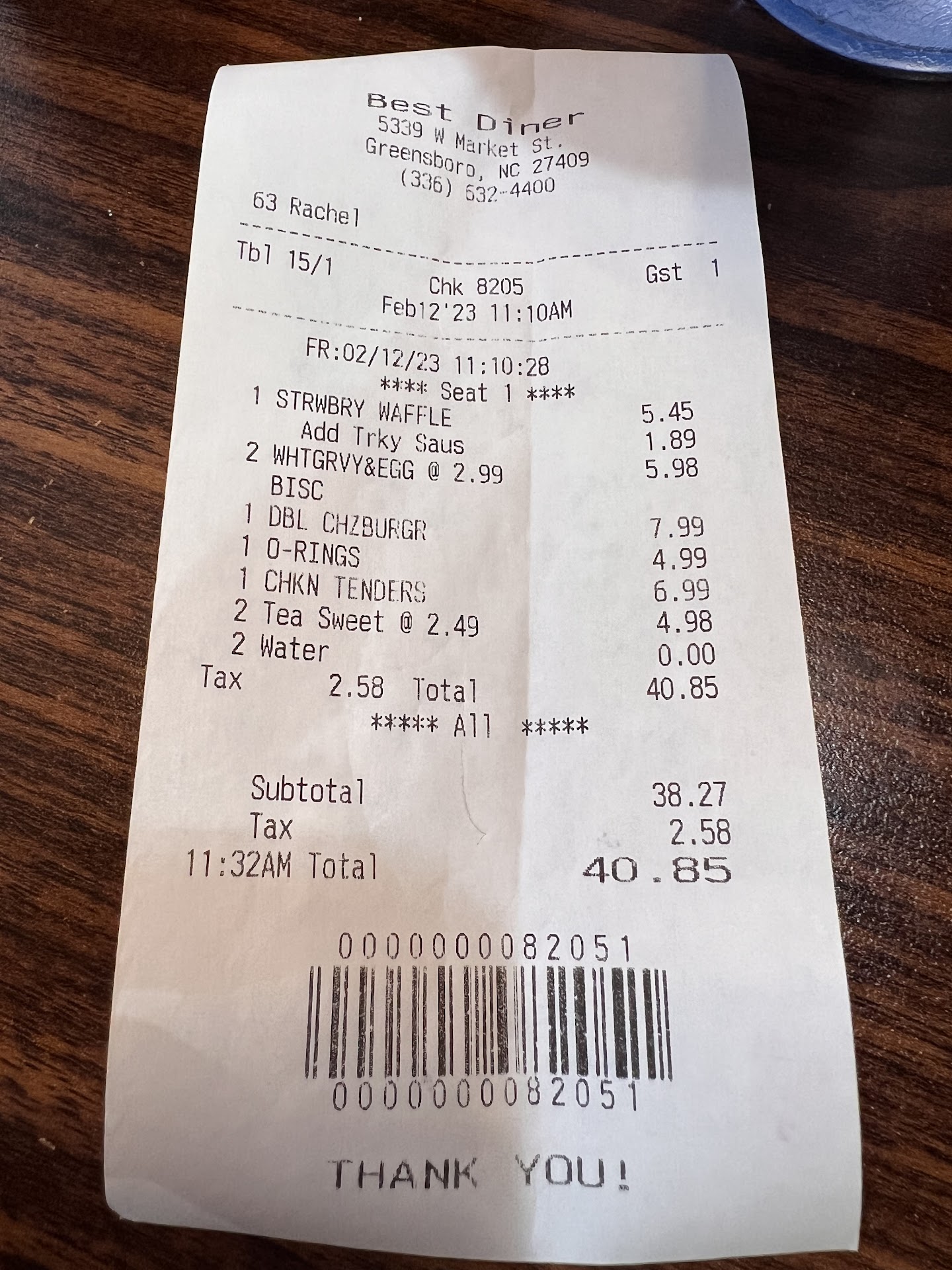 Read moreBest Diner left a bad taste in my mouth. I donât even like leaving reviews but something has to be said and I hope management does something to correct these issues. Upon arriving we sat at a booth and waited more than a few minutes before anyone acknowledged us. The first server walked over to get our drink order to which we replied âcoffee, water, cokeâ, they didnât bother to let us know they did not have coke and the second server came over to let us know they had Pepsi products, thatâs fine and all but it shouldnât take two servers to figure that out. When they finally brought our drinks, they forgot to bring the water I asked forâŚ.whatever, not that big of a deal. The coffee was terrible even after adding cream and sugar. When the server took our order, she wrote everything down on a guest check and then walked around the counter and dropped it by the computer and walked away. Wouldnât you want to get that order in right away? I watched the kitchen pile plates under the heat lamp in the window and the servers didnât even bother to look to see if the food was ready to run to tables. Our order was fairly simple, cheeseburger, fries, 3 pancakes, eggs. All of the food was particularly bland as far as taste. My fries were burnt way past âgolden brownâ to just âdark brownâ. The burger was just okay after covering the whole thing with ketchup. The pancakes were bland and tasteless even after loaded up with syrup & butter. I kinda dreaded going up to the counter to have the server ask me how everything was and Iâd have to tell her everything was terrible, but she didnât. Left a $2 tip because Iâm not a complete scumbag and got out of there for the...