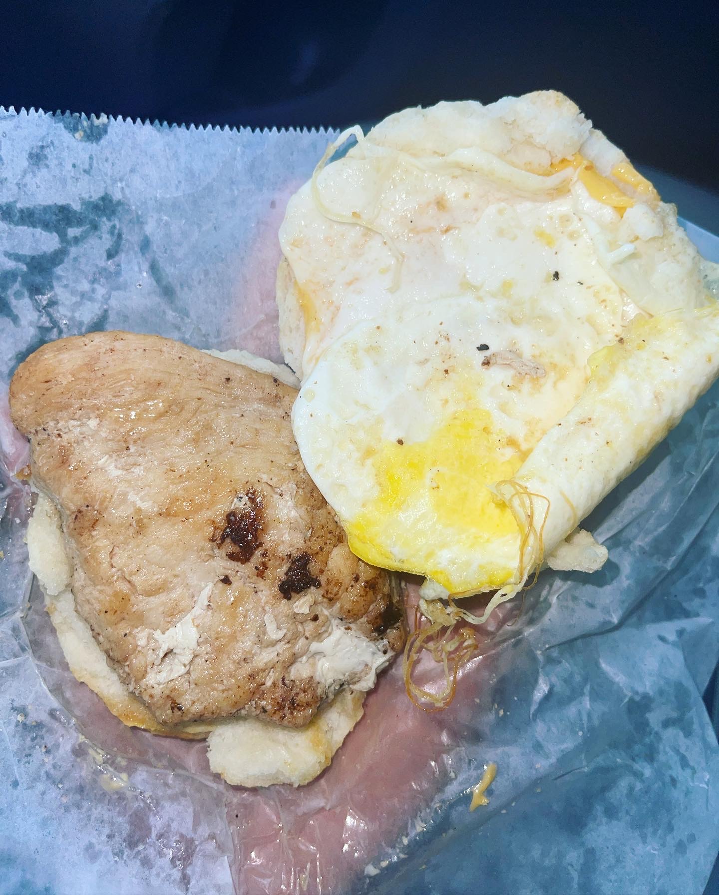 I ordered around 11:37pm inside at the register. The cashier was really friendly and I could see the other staff working hard. There was one person in front of me. I got the grilled chicken, egg, and cheese biscuit with fries and a strawberry tea. The total was about $9.92. My food was ready about a minute later. I forgot to ask for ketchup for my fries, so luckily I had some BBQ Sauce from Cookout in my car lmao. Wedges just don’t take that well plain, unless they are well seasoned. My biscuit was pretty tasty. It was the right temperature. The strawberry tea had actual strawberries in it, which was amazing. I love strawberries! Lol. The only downside is that it can block the straw opening while you’re trying to drink, lol.