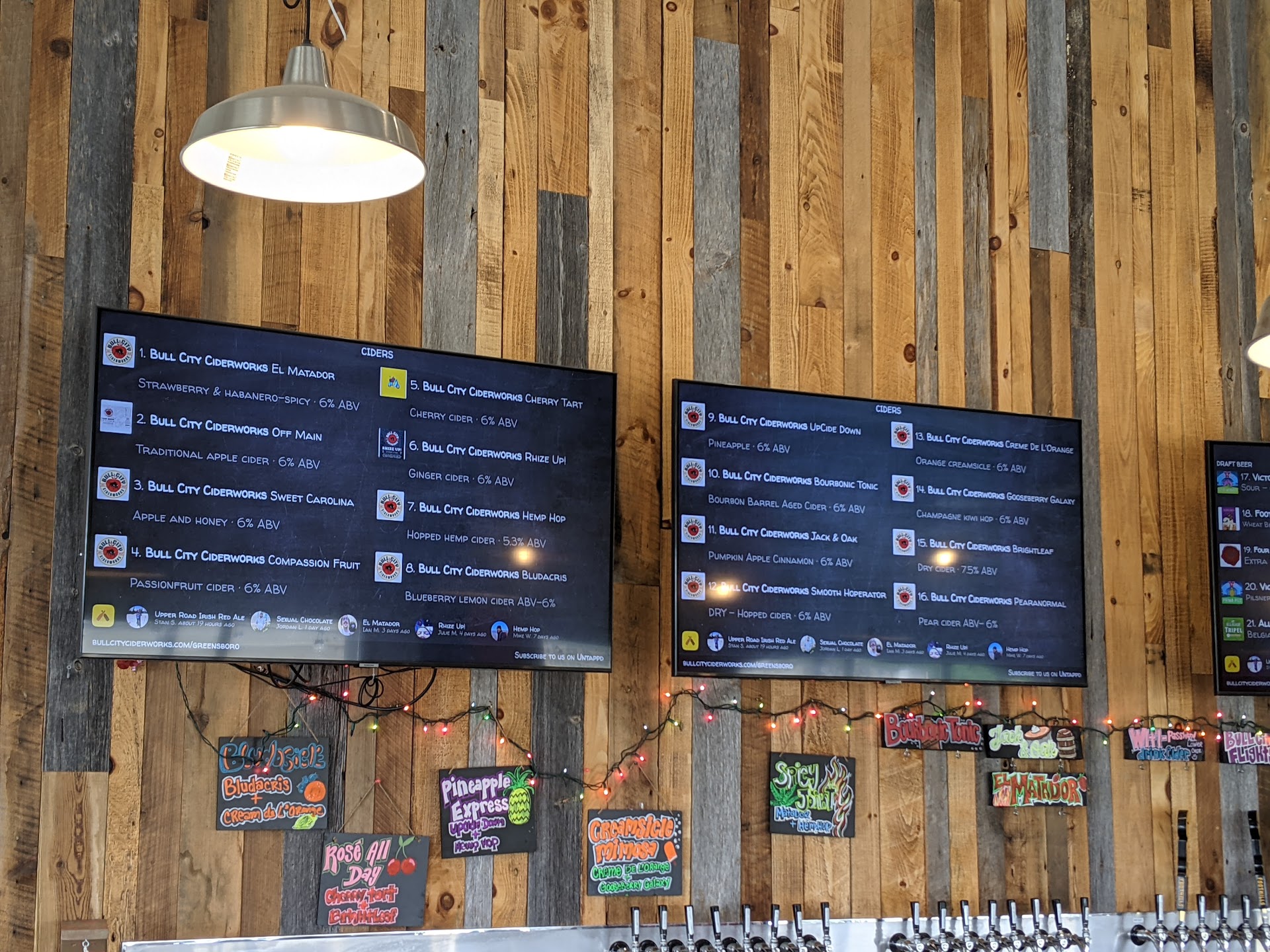 My wife and I were in “try it all” mode and split a pair of flights. We were able to mix old favorites (Cherry Tart, Cardinal Cin, and Rhyze Up) with new seasonal offerings. Rico Guave (guava) was a hit, and though I am not always a dry cider fan, Brightleaf (a crisp and clean unfiltered) won me over. Spruce Bringsteen tasted like drinking a Christmas tree, and though some may find that offputting, Bull City definitely gets points for originality.