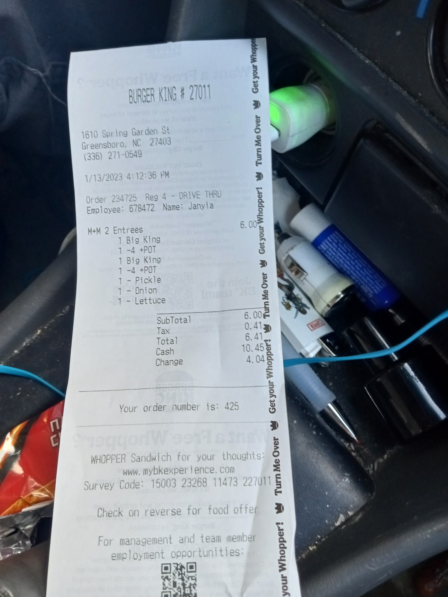 Read moreHonestly, i won’t be returning to this Burger King at first i thought it was the best Burger King in Greensboro but now NO! I always place mobile order last two times the orders have been wrong .. today i had to go back in the line again because they gave me wrong sandwhich there was a guy behind me who’s order was wrong as well. I ordered a bacon double cheese burger first time they gave me just a cheese burger went back around she gave me a new bag got home and it wasn’t a bacon double cheese burger it was a bacon cheese burger .. it’s sad because i believe the manger made the order and it still was wrong .. wish i could get my money back or something but it was a reward i was got on the app i also reported this through my mobile app as well and they said somebody will contact me .. this is literally my second review to this Burger King something told me don’t go back tonight but i did anyways .. oh did i mention waiting in line for 15 mins just to get wrong order smh...