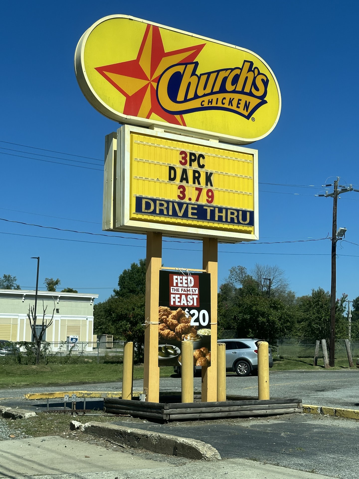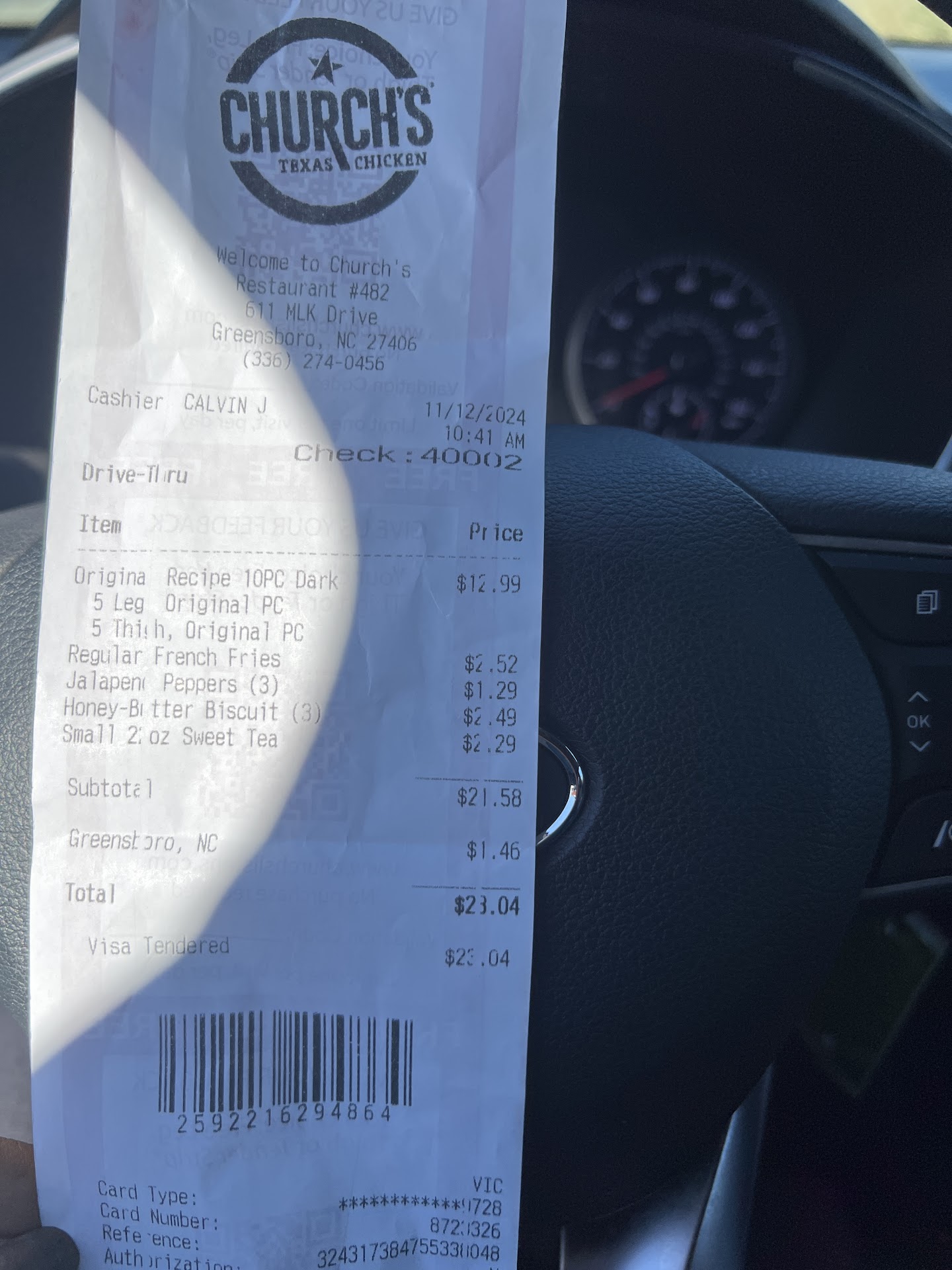 Read moreTERRIBLE!!! As the last church’s in Greensboro this place needs to be shut down!!! First the speaker system is terrible and the girl kept repeating my order like she wasn’t paying attention. Second, I get to the window and my total was over $30 for two wing dinners. Get to the window, they don’t have wings ready and asked if I wanted a breast instead. They hand me my food with only one order and no drinks so I’m still sitting thinking she is going to bring me the rest of my $30 order and she had the nerve to come to the window and ask if I needed hot sauce! No lady I want the rest of my food I just spent $30 on!!!! Then I had to show my receipt like I didn’t just order it! After sitting another couple of minutes they handed me my other order. My drinks were hot and had a coffee top on it and no straw! Got home and they still didn’t give me my other side that I paid $3.99 for and I had two! I really wanted to go back and get a refund but I had just got off of work, exhausted and ready to get home! And that location is not convenient! Long story short, it needs to be shut down! I will travel all the way to Winston or just go to Popeyes! The level of service and comprehension is so low at this location! This is not the church’s we are used to! Don’t waste your time...