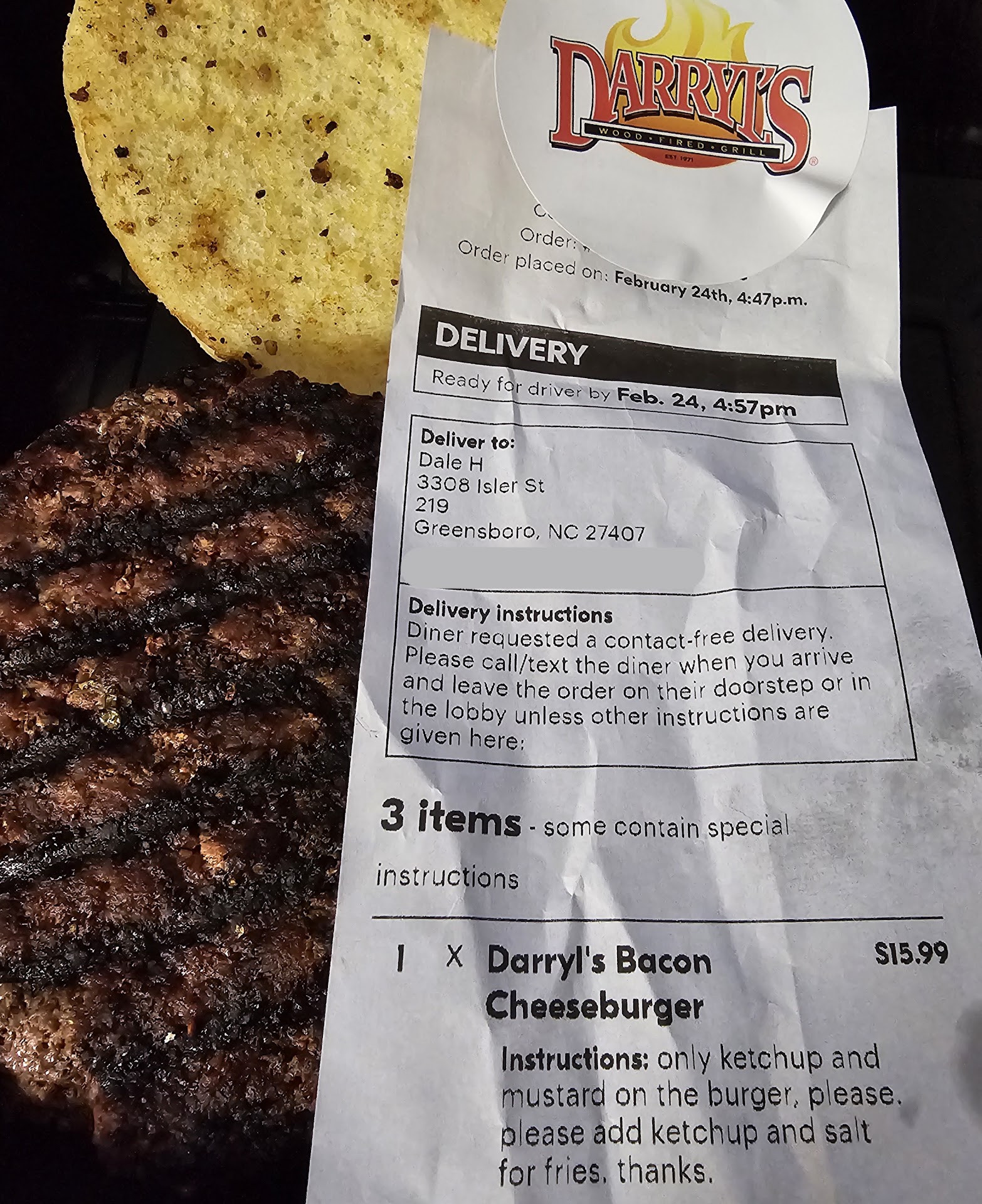 I'm traveling on a music tour right now. We travel by tour bus, so don't have a car to get around in. For this reason, I often order food to be delivered to the hotel. Tonight, in Greensboro, was quite adventurous. On the way to the hotel, I had seen Darryl's Wood Fired Grill. So when I ordered food, I decided to try it. I found them through Yelp, and they had a link to order delivery, so I did. I ordered a bacon cheeseburger and for it to have ketchup and mustard only on it. The delivery was handled by GrubHub. Once it was delivered, I brought it in to eat. I opened it and found a bun, a hamburger patty, and some ketchup and mustard packets. NO BACON OR CHEESE! I called the restaurant and got the manager. I think his name was Allen. He listened to my story, then went and found my order, and verified that I should have had bacon and cheese. He said I would have to contact GrubHub for a refund. I told him that I didn't want a refund. I wanted dinner. I told him the mistake was not GrubHub's, it was theirs. He admitted it, but said there was nothing they.could so. I said okay, that I understood. I was just out $35 and had no dinner, so I guess my review would just have to tell my story. Then he offered to personally deliver a new meal to me, since I wasn't far away. I told him that I didn't care if it was him or someone else, but I would like what I ordered. So I hung up, expecting to have my burger soon. Almost two hours later, no burger. I'm more upset about being lied to, than I am about the burger. I was hoping for a nice meal from Darryl's Wood Fired Grill. Unfortunately, I didn't get it.