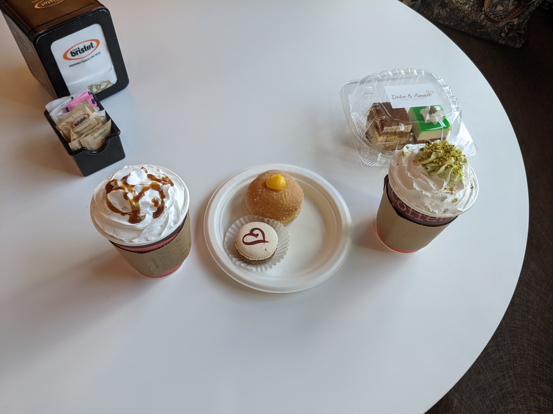 Ā Ā Ā Read moreI might just have to become a regular here. We tried their pistachio hazelnut specialty cake and millefoglie with a decaf americano. They were both so freaking good. I'm impressed by their expertise. I have tried just about everything and I have always been happy with the taste of their desserts. I've recommended them to all of my friends and they all enjoy the desserts at Dolce and Amaro. This is by far the best bakery in town. We've only had one negative experience since the first time we visited shortly after opening day. Our special order cake was quite wrong. We ordered a round, chocolate colored cake with one rose and two macaroons on top for our wedding. I asked for no hearts drawn on the macaroons. The cake was the same as an orange cake that they had a photo of in an example book and on their Instagram, the difference was the color. We received a heart shaped, bright red cake with macaroons along the side and hearts drawn on some of them. The lady was kind enough to help us make it a little bit closer to what we wanted, but it was still far off. It tasted absolutely amazing and I would definitely order a cake from here again, but I recommend double checking the notes of the person taking the order just in case. A picture of the modified cake is below (hopefully it will upload). Again, it tasted amazing. It wasn't what we wanted visually, but it wasn't...
