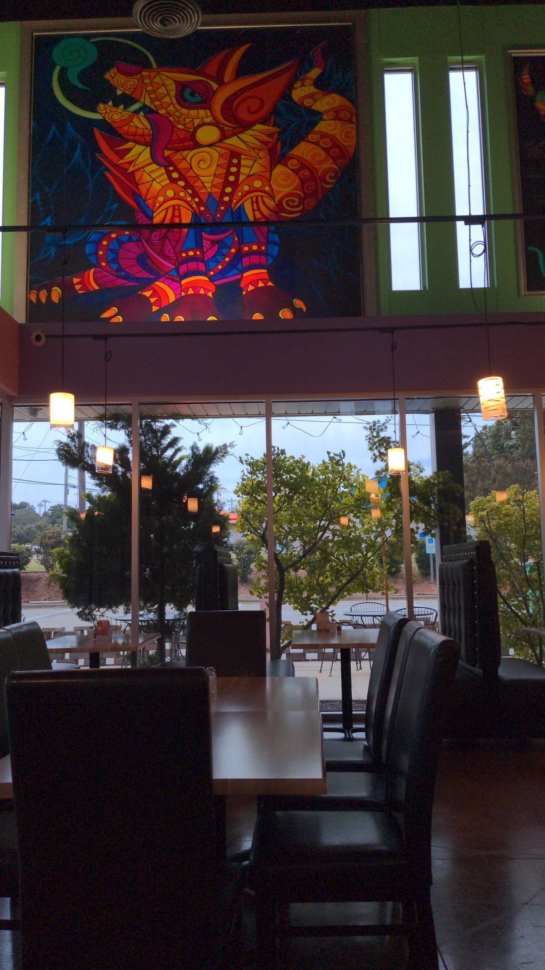 El Alibrije has some great design choices, with the seating area furnished in dark leather chairs and lighter tables. But the upper part of the room is decorated in large, brightly colored paintings of creatures from Mexican folklore--the Alebrije of the restaurant's name. It's a beautiful contrast with the dark furniture.