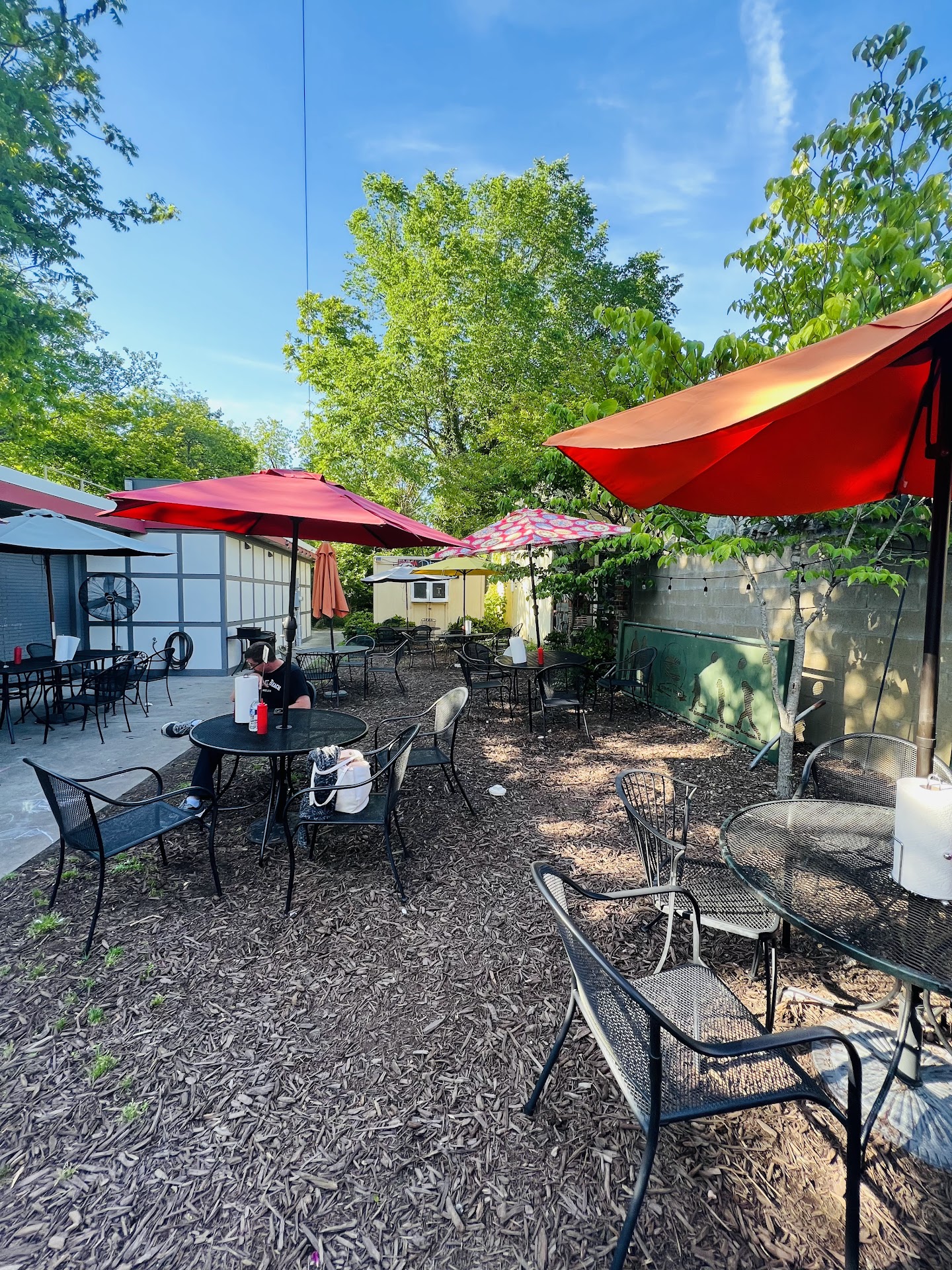 Been years since I have been here--well before Covid. The indoor dining room has been closed for several years now and outdoor seating only. There are maybe 7 tables available outside with umbrellas. Dog friendly area with leash tie-up thingies and water bowls. Sidewalk chalk for the kiddos (or adults) to draw/write. The outdoor area is cute. All food is ordered from a pickup window. Dine in (outside) the food is brought to your table. Service is quick.