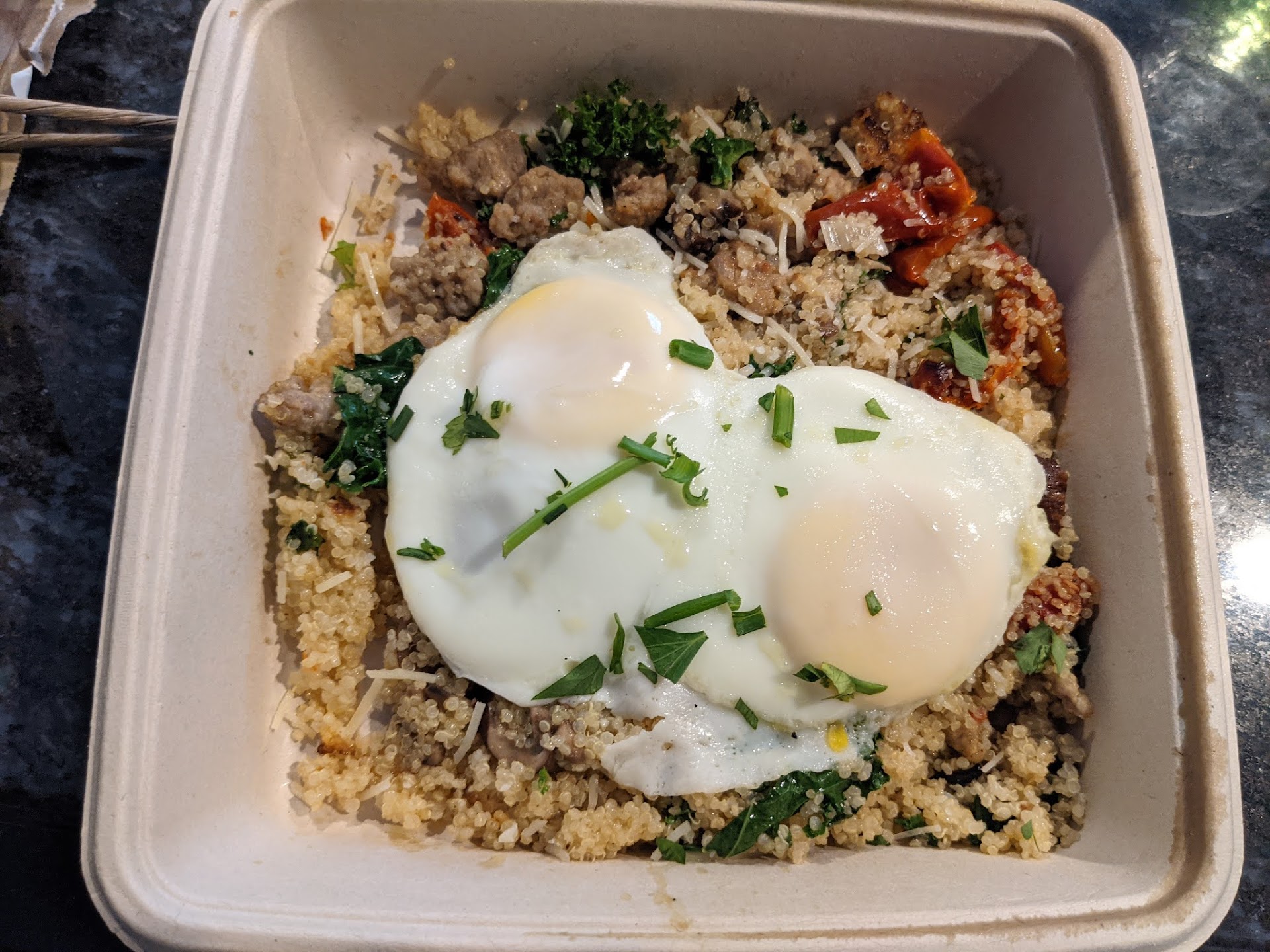 For my first time out, I used the restaurant's Web site to order a Power Breakfast Quinoa Bowl (quinoa, Italian sausage, Crimini mushrooms, tomatoes, kale, Parmesan, and eggs) and a Kale Tonic (Kale, fuji apple, cucumber, and lemon) for pick-up. The food was ready within a few minutes of arrival, set on a table marked for take-out orders by the front entrance. By the looks of things, First Watch seemed to be going for a rustic chic vibe. It also seemed like the kind of place that crowds easily, which made me thankful that I wasn't dining in.