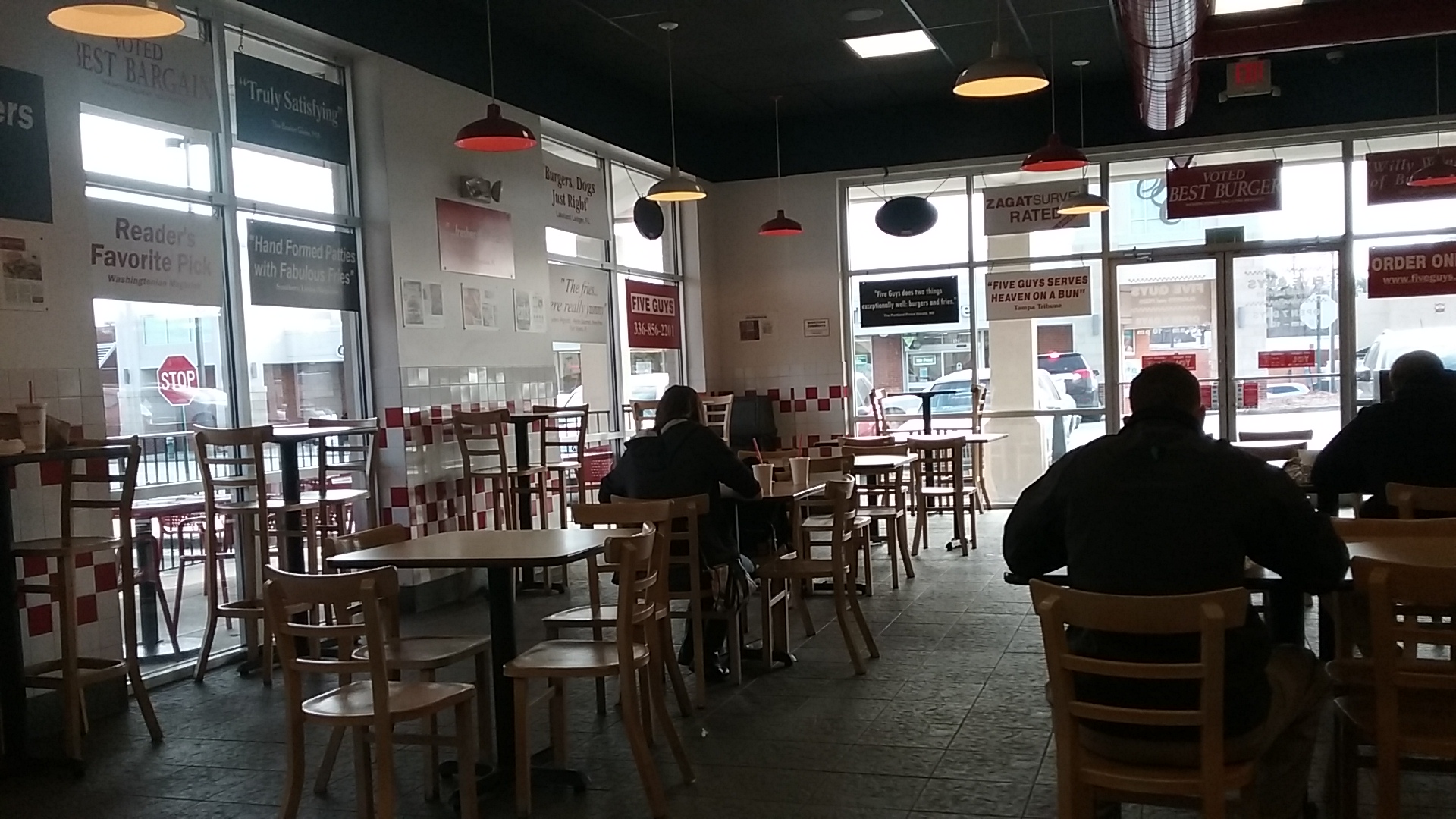 This place is not good. Years ago it had great service and everyone treated with friendly prompt service. The last several years it just keeps getting worse. I have been numerous times when it wasn’t busy. I was the only one ordering, no one else in line, and maybe two people inside eating. Didn’t matter what day I would go it was the same. They would take my order and then they would walk out of the front and hang out in the back. No worker was out front. Then someone would eventually come out later saying someone would be out. Then finally someone would drop the already filled fry basket of fries in the fryer, that was all I ordered. I would always sit 8 minutes or more just waiting for someone to drop the fries in the fryer. I mean I could’ve done that myself. I didn’t know it took a company meeting and drawing of straws for a worker to drop a basket of fries in the fryer. Other people had just gotten their order that was eating, so it’s not like they had to wait to turn the fryer on or anything. They are rude and stand there staring at you with a scowl on their faces. They overcook the fries and don’t give out the full amount of fries either. I’ve given chances and I don’t write reviews, but it’s ridiculous at this five guys location in Greensboro. Also five guys fries and food are priced more expensive in Greensboro and surrounding areas such as High Point and Kernersville, than in Cary. Just think that’s odd, if anything I would expect the food to be more expensive in Cary...