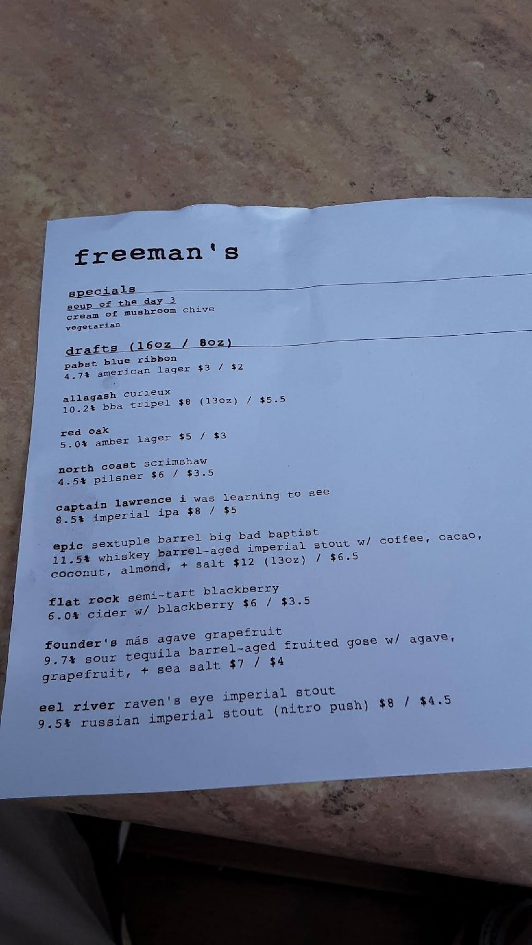 If there is one drawback to Freeman’s, it is that it is tiny. There are only a few tables within, so you are most likely looking at bar seating. This wasn’t a problem during my visit — there were few patrons and the lone bartender was both capable and amiable – but I wouldn’t want to be here when it’s at capacity.