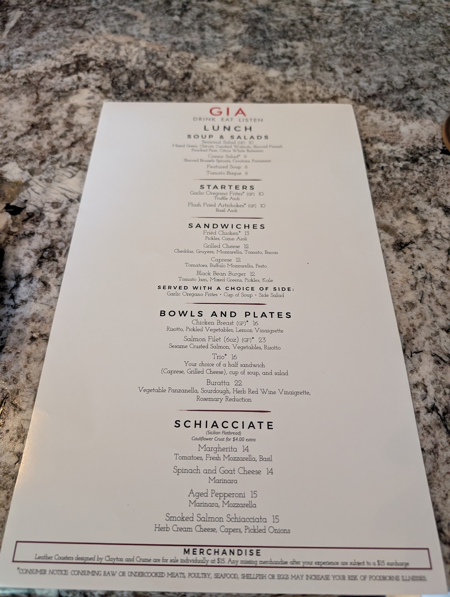 So just got back from my floral association meeting! We had it at Gia Drink Eat Listen, on New Garden Rd. and I figured I would do a little review on my experience. First off, the space itself if fabulously decorated, and has a very rustic feel to it. I had a starter cocktail called the Femme Fatal, (Grey Goose Cherry Noir, Lemonade, Grenadine, and Prosecco) off of there signature cocktails which are $11 each, and there is a list of about 20 or so. We had a specialty menu with limited choices, but it was very well done. Everything came out in a tasting size, and there were 4 courses. First we started with a "Chef feature salad", which is how it was presented on our menu. It was arugula, fresh snow peas, cherry tomatoes and cucumbers. Now I can say that there was a great deal of the toppings on the salad, but it didn't have a drop of dressing! After quite a few of us had asked for dressing they brought out what I could assume was, mayo, lemon, salt and pepper mixture. (Just a side note, the salad was the ONLY thing that was not to my liking!) Following the salad, was our second course of assorted schiaciate (Sicilian Flatbread). These were especially yummy, we had 4 different types I believe! There was a, sweet pepper and spicy italian sausage, with mozzarella; a spinach and goat cheese; tomato, mozzarella, and (I believe basil, I did not try this one); and the last was a classic pepperoni! Our third course was a wood fired cauliflower with garlic, red onion and basil vinaigrette! This dish was probably my FAVORITE of the evening! Absolutely incredible! Our main course was between a pan seared chicken with prosciutto, lemon, and a marsala reduction with sauted spinach or a five spice salmon with ponzu sauce over a spinach salad and mandarin orange slices. I myself had the salmon, which was very moist and flaky. I had ordered it rare, but it care out about med-rare to med. and was perfectly fine! With my dinner, I had a glass of Montipiller Pinot Noir, and it had an incredible flavor of fresh wild berries and vanilla with just a hint of spice! Minus the alcohol the price per person was $25, we had a group of about 20. All in all, I say that this new establishment is a welcome addition to Greensboro, I wish it the best of luck and I HIGHLY recommend that my fellow Greensboro Citizens to go and EAT, DRINK, and LISTEN with Gia! My compliments to the chef and the owner! You and your staff were wonderful! I enjoyed my first visit and can not wait to come again for dinner! Il pranzo era delizioso. Grazie...