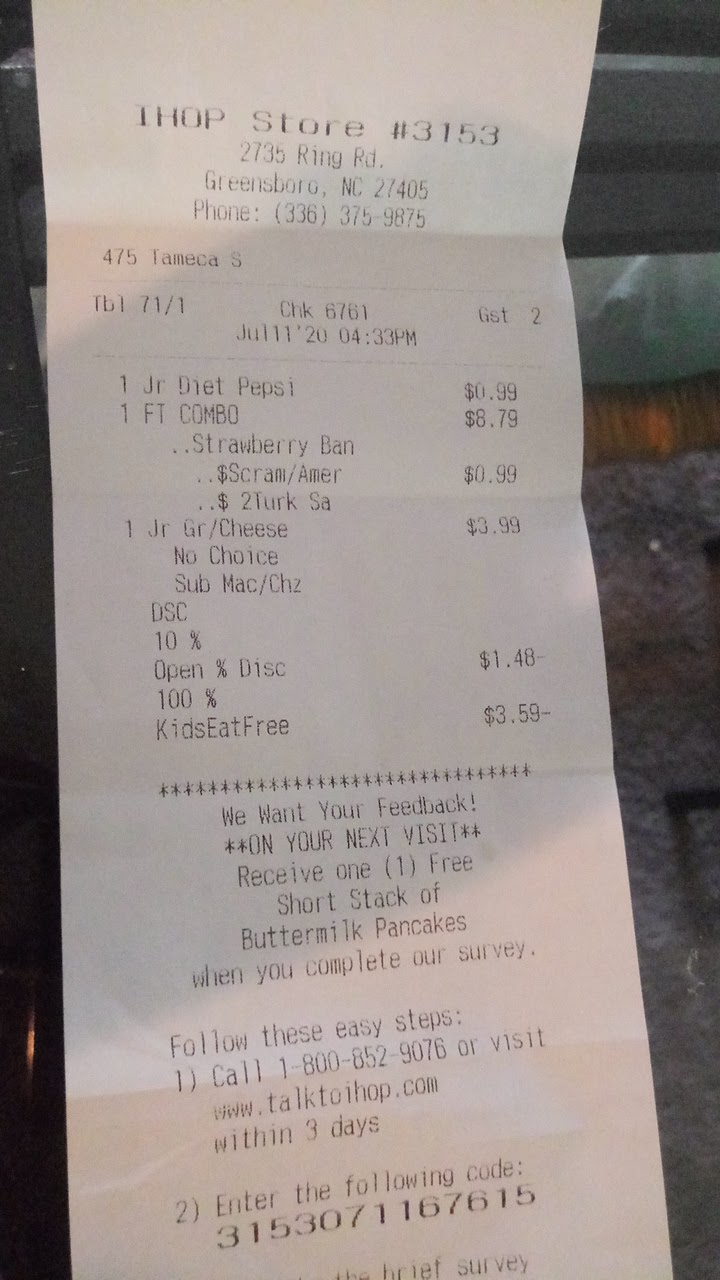 Ā Ā Ā Read moreSo my daughter wanted to go to IHOP. I had second thoughts because I had a bad experience at the IHOP on wendover. Which I also did a review on. We go into the IHOP on Ring Rd. My baby orders the grilled cheese and instead of applesauce she wanted Mac and cheese and a root beer to drink. I order the french toast combo with the 4 french toast with strawberry and bananas, turkey sausage links, eggs scrambled hard with American cheese then grits with American cheese with a water light ice. We got our drinks. Didn't take too long for food to come out considering what we have going on with COVID-19. So time goes by and we get our food. Savannah is satisfied and I was also until I seen my grits. I should've taken a picture but couldn't process what I saw and immediately got upset. Again I asked for grits with American cheese. It has been times where I've ordered grits and not specified what kind of cheese I want and they put it on top. But the grits I received were stirred up as if whoever made it was about to eat it. Then I looked at it even more and it's chunks of grits in the bowl. So Victor or Hector whoever was in the kitchen gave me the bottom of the barrel. So I politely called the waitress over manager whomever I told because no one really introduced themselves. I told her I wanted more grits and do not stir them and showed them to her. She goes in the kitchen and he says they're out. Her cook should've communicated with them that he was out of grits when she went back and put out order in. The waitress even agreed with me when I said it only takes 5mins to make grits. I have not EVER went anywhere and you order something with cheese and they STIR IT UP. Not to mention yet again we're dealing with this COVID-19 STUFF. I also told her I wouldn't feed those to my child and I wanted to see him eat the grits and if he was ok with giving the grits to his child he was pathetic. AS LONG AS MY MONEY IS GOOD MY FOOD SHOULD BE GOOD. If you work somewhere and you don't take pride in your work, I'm guessing that's not the job or profession for you. So I was only offered 10% off my bill the kids meal was already free because I purchased combo. Didn't even offer to make some grits for me to leave with because I had lost my appetite by then. Me and my baby won't be back I might not stop the business, but I can stop them from getting my time and hard earned money. I DON'T CARE HOW MUCH THE BILL IS. #CUSTOMERSERVICE...