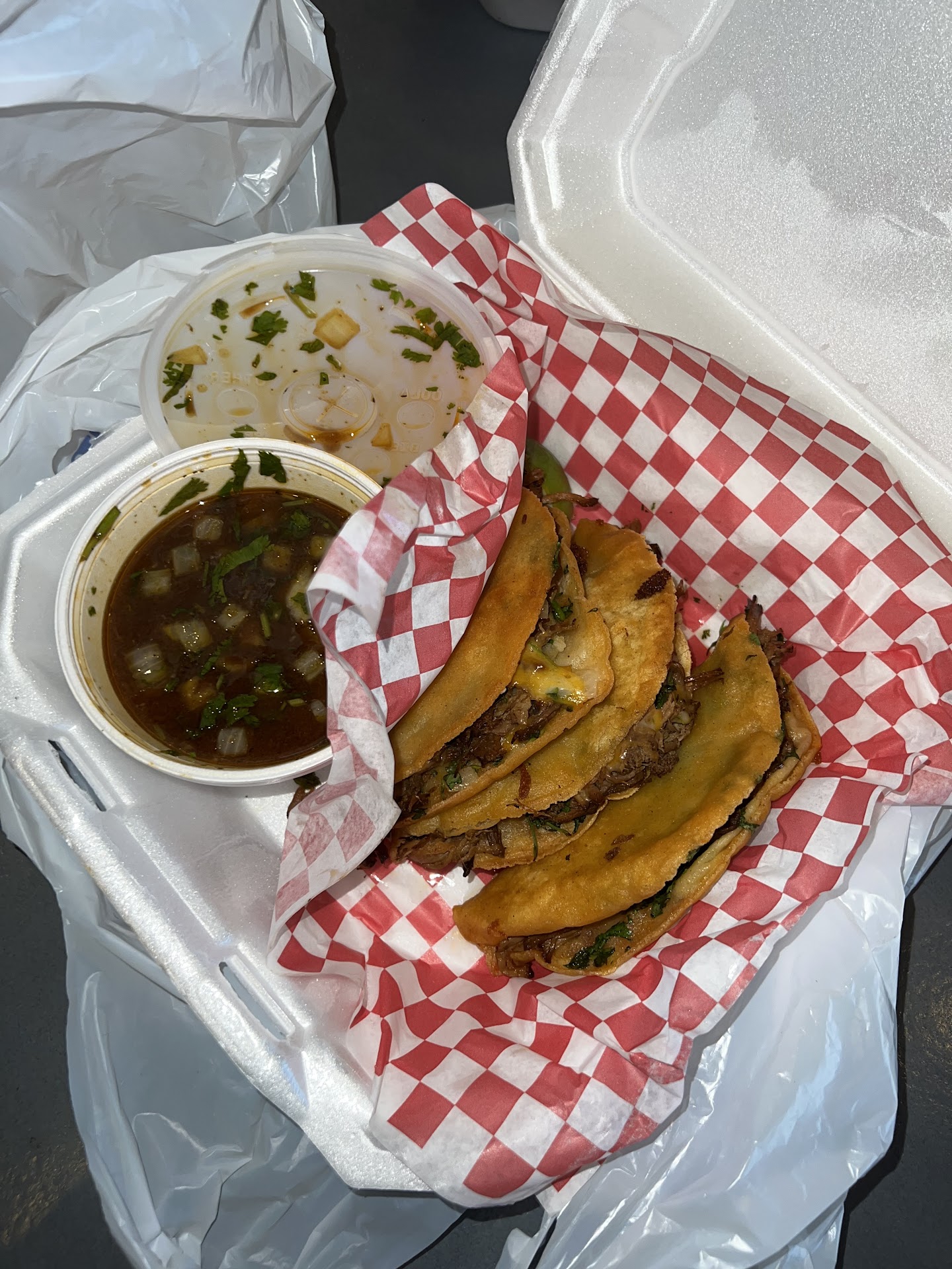 Second, the flavor is unmatched. We've tried quesabirrias at 6 Greensboro locations in the last month. This is in the top 2! This pizza is the same as the Quesabirria tacos, except they use 2 big flour tortillas. The tacos use corn. But they did a good job of .aking the flour tortillas crispy. The meat is tenter and juicy, has incredible flavor, and was cooked to perfection. There was plenty of cheese all the way through. They asked if cilantro & onions were okay, so don't fret if that's not your jam. The consume was the best. Fulled with lots of flavor and bits of cilantro & onions. I was worried that it would fall apart while dipping, but it held together! Definitely 10/10 would recommend.