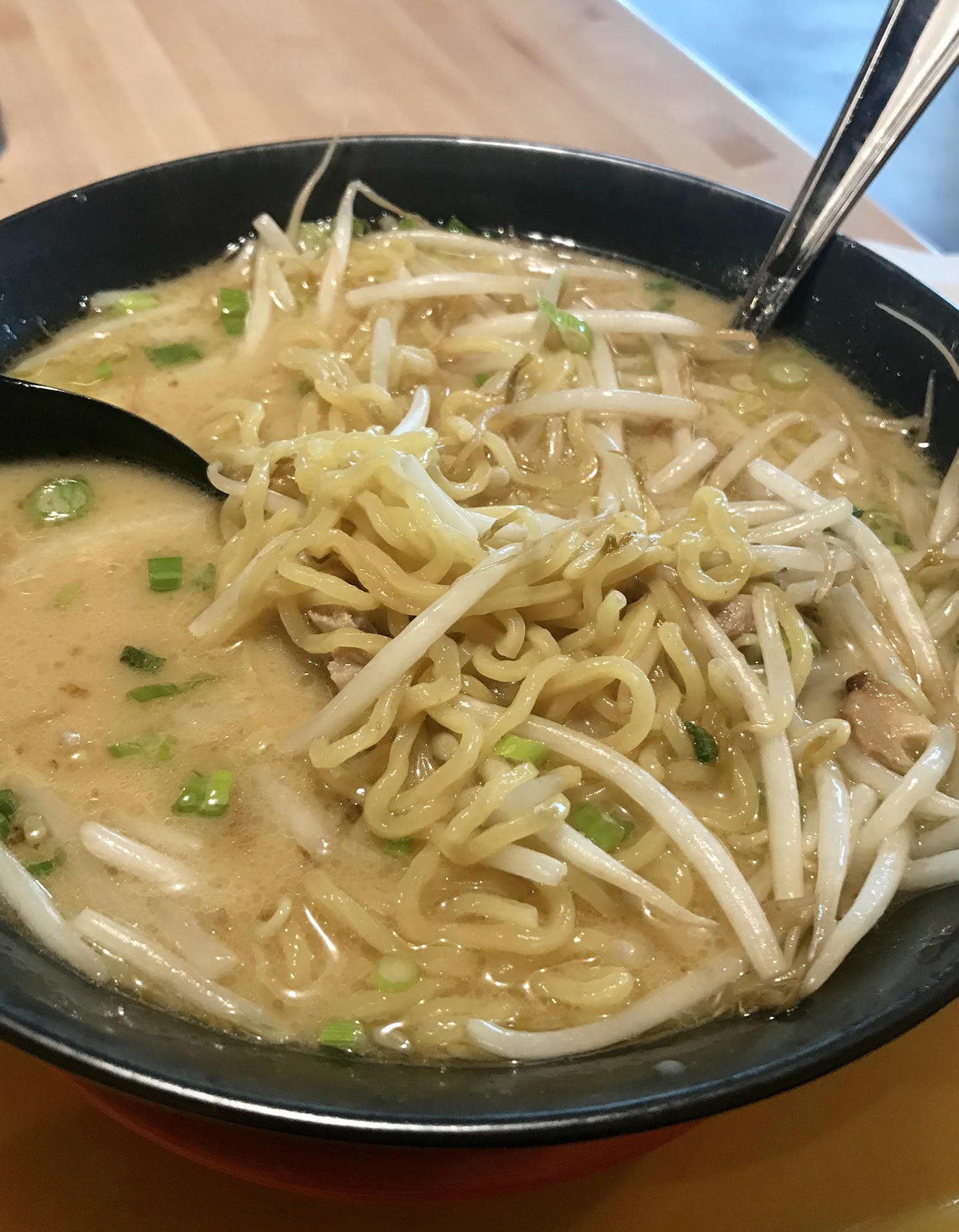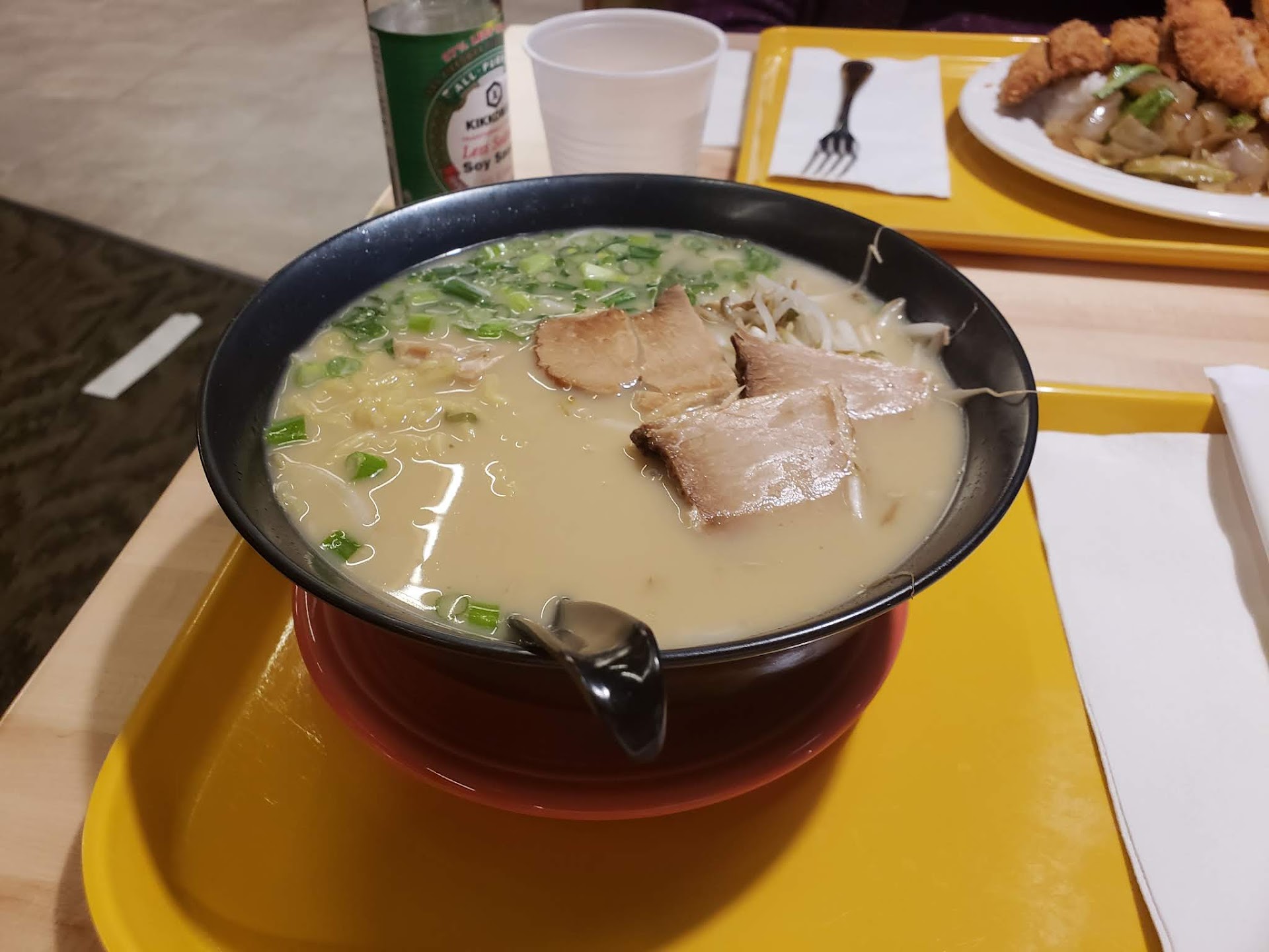 For our first visit, my wife and I opted for a chicken katsu hibachi, a pork tonkatsu ramen, and an onigiri (tuna mayo and shrimp katsu) apiece. We didn't have too long to wait before our pager started buzzing though not everything was ready all at once. The food had both hits and misses. On the plus side, the katsu chicken was cooked well - it held its breading without being dried out - and there was plenty of it. The ramen was a generous portion as well, and the broth, though understated (next time, I'll opt for spicy), had the right flavor profile. Both onigiri were satisfying too. Though billed as rice balls, they are more akin to hot sushi pockets, seaweed-wrapped envelopes of tastiness that proved the highlights of the meal. On the other hand, the hibachi vegetables, listed as zucchini and onions, contained far more of the latter than the former, the ramen was a bit light on meat, and the katsu's tonkatsu sauce lacked the expected hints of sweetness.
