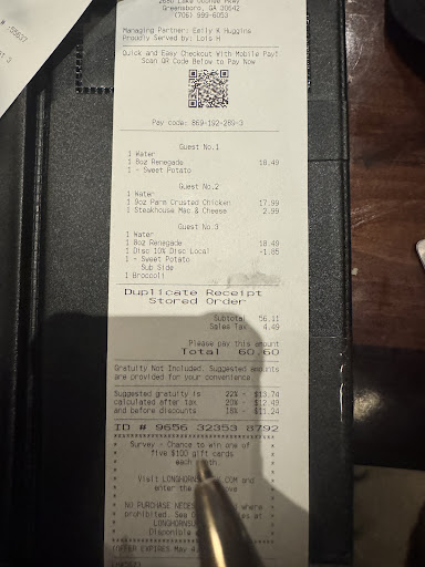 She quickly came back with the bill and offered us desert to go which we declined. She said the manager discounted my steak 25%. I was not going to complain, but the meat was overall poor quality, then add in undercooked. I was also disappointed the GM did not come to the table.