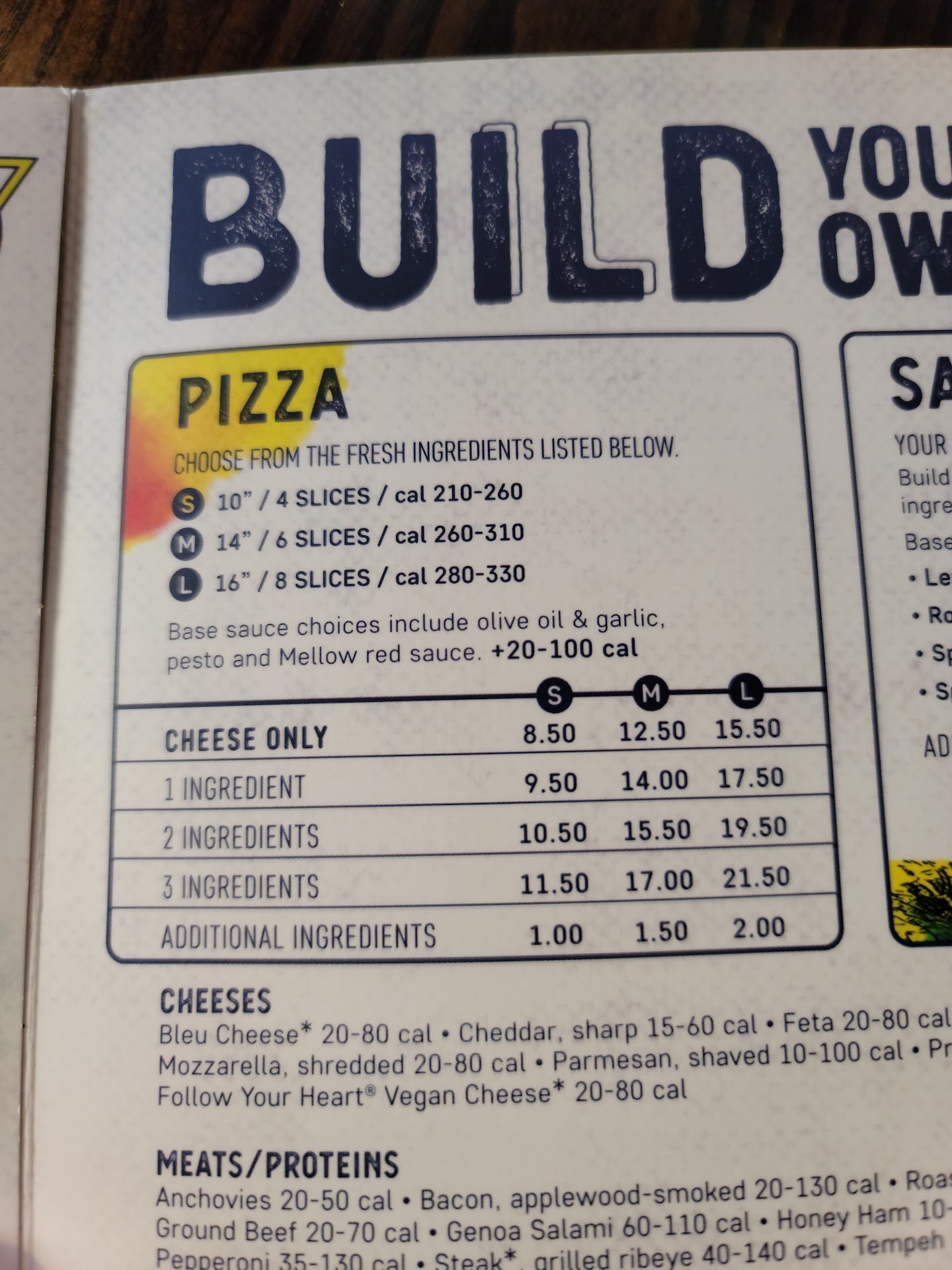 The menu had 4, 6, and 8 slice pizzas that were 12", 14", and 16" respectively. There were speciality pizzas, and build your own. I ordered the equivalent of a 16" Supreme and it was right at $25. Another person ordered the equivalent of a Meatlovers and you wouldn't believe the large amount of bacon on it. In all, our group had 4 large pizzas and not a single slice was left. Salads, subs, and local favorites are also on the menu.