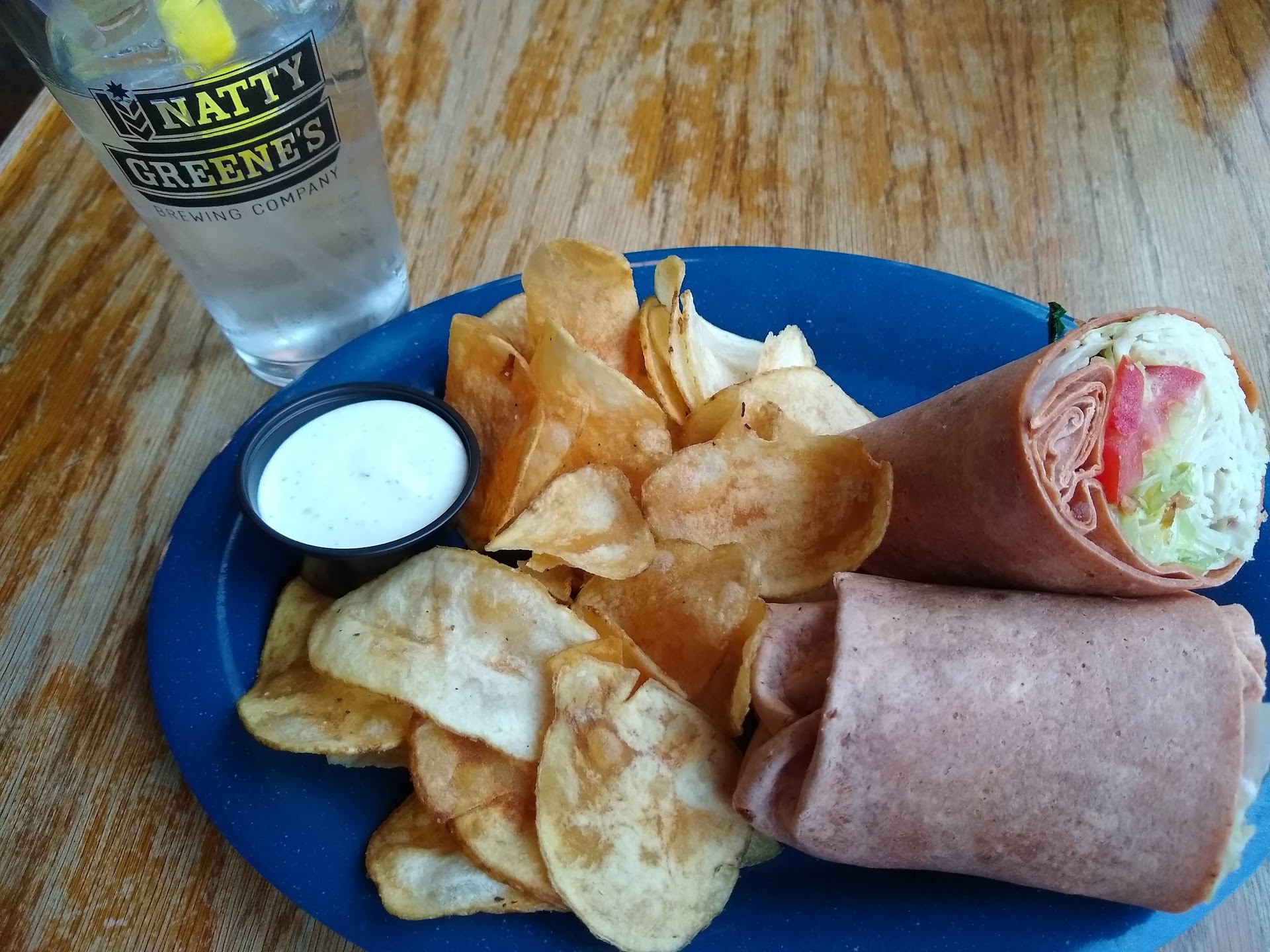 I ordered a Smokin' Turkey Wrap and potato chips. The menu described the wrap as roasted turkey, bacon, provolone, lettuce, tomato, and Chipotle-Razz mayo. I like things spicy so I thought this sounded delicious. My potato chips we're freshly cooked and served with a small amount of ranch, which I requested. My drink was ice water with lemon. My meal cost $9.00+tax.