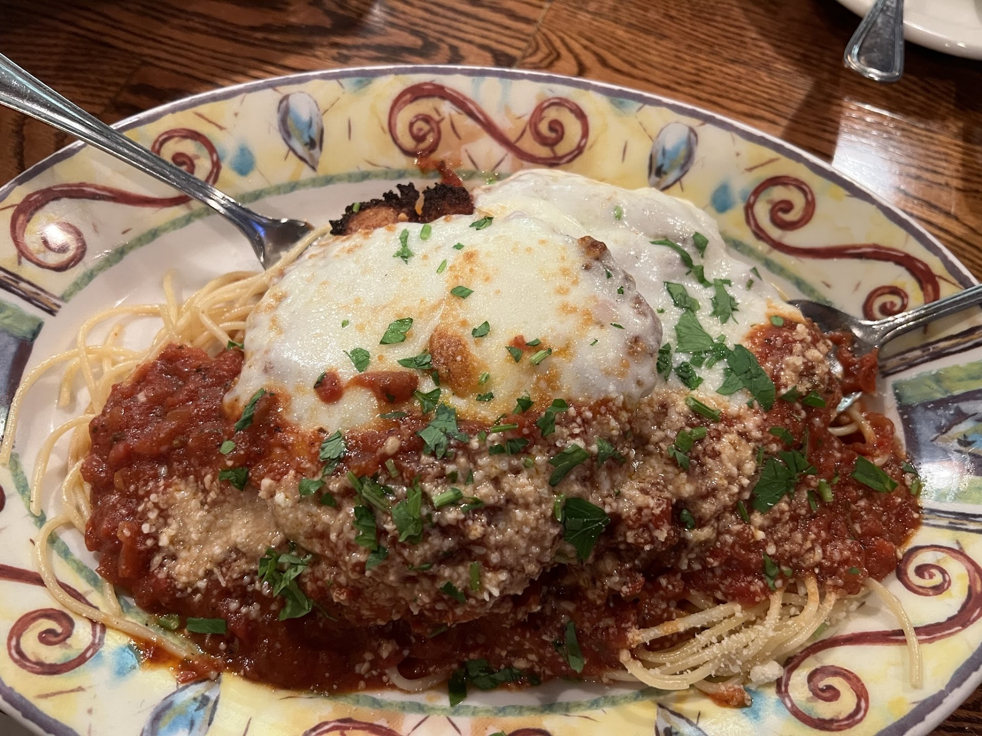 I always order chicken parmigiana at a new Italian restaurant because, for me, that's the baseline for a good Italian restaurant. I didn't see spaghetti anywhere on the menu (strange for a restaurant called "Pastabilities"; spaghetti is not possible?). The young waitress with short bleached hair said to me "Our linguini is spaghetti." Riiiiight. I'll just let that one go. I also noticed that she was much friendlier to other guests. When I asked for things (I had to ask for silverware when she delivered my salad), she wouldn't acknowledge my request. She would just turn around like I was a terrible inconvenience in her day and come back eventually with whatever it was that I needed. I'll let ya'll figure that one out.