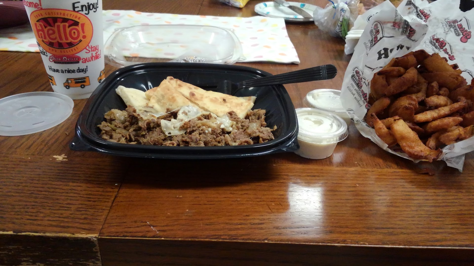 The facility was clean and inviting. Although it was lunch time there wasn't that many people crowding the sitting area. I ordered steak and cheese w/ grilled onion, with pita bread and a double order of onion petals...