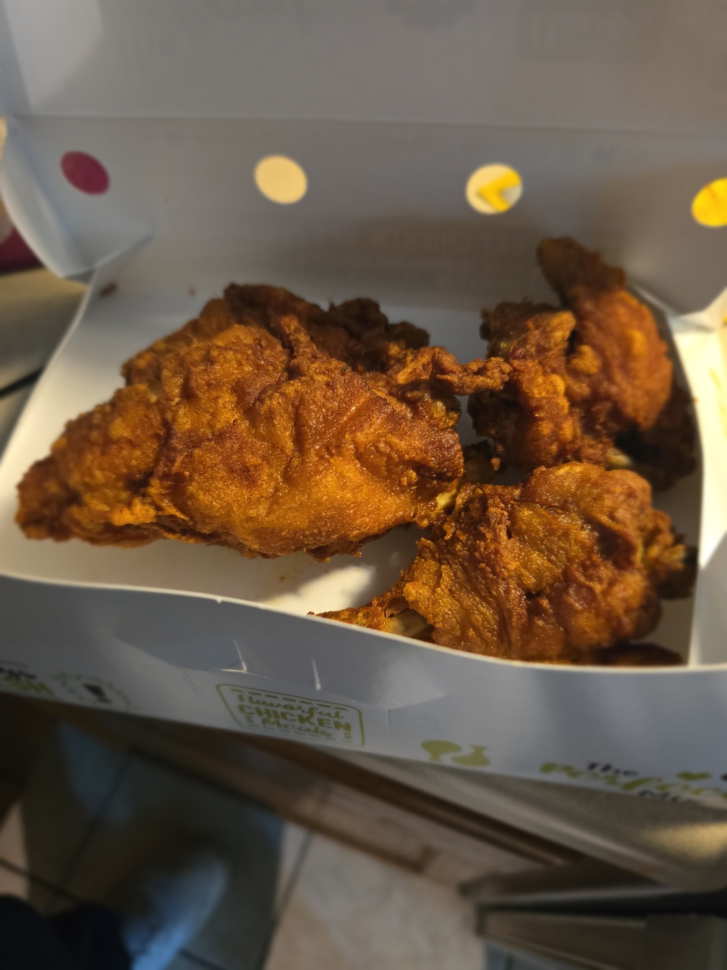 The atmosphere was super nice and clean following alongside the bathrooms. I like the simple food joint look to it all on the inside it would be especially nice if they added some small chicken decore around the place.