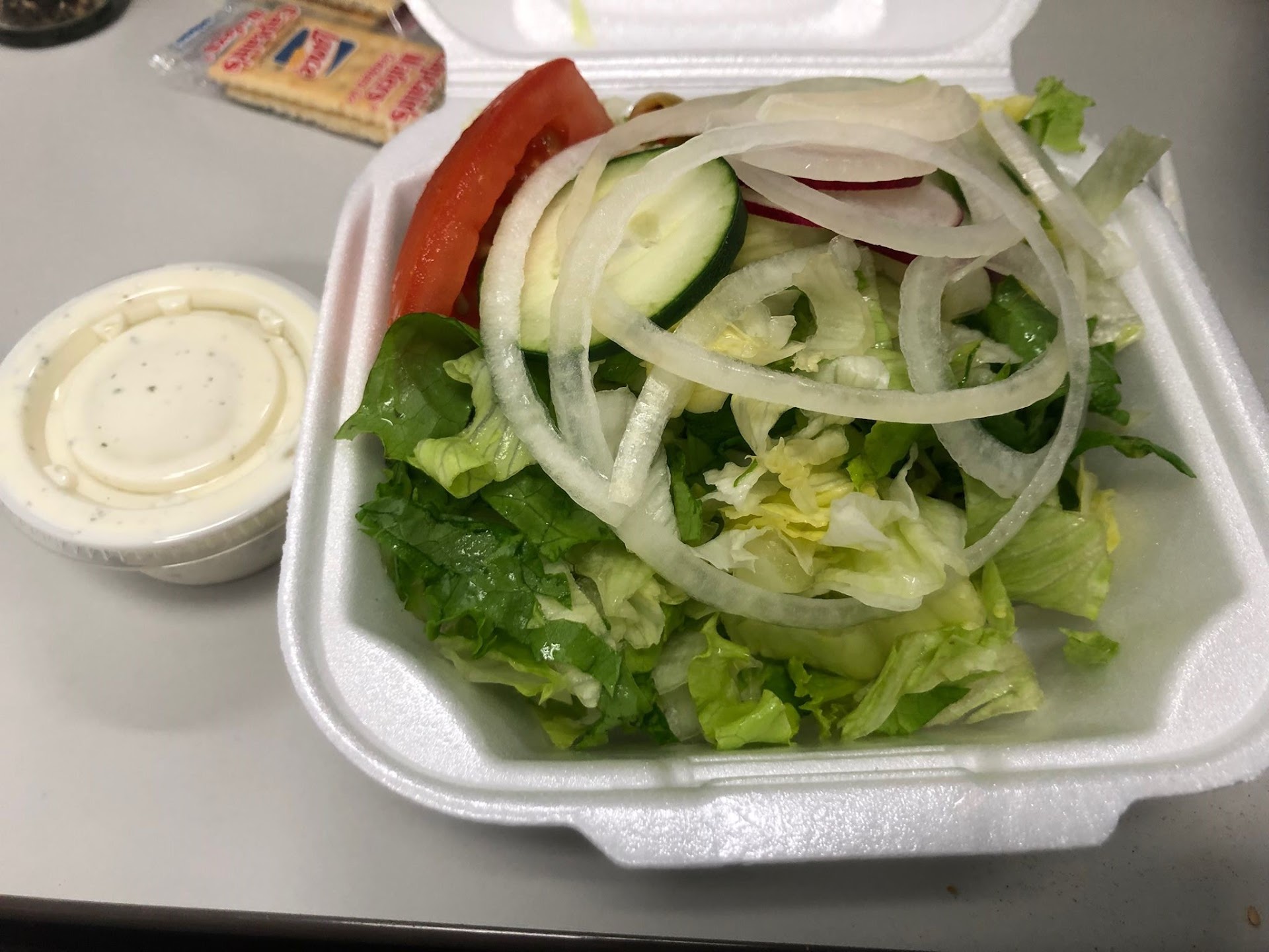 I figured I'd just eat the salad. Wrong. The salad had whole sliced rings of onions on top, like they were putting them on a burger. I asked for french dressing, they gave me ranch or some kind of cucumber dressing, which I don't like.