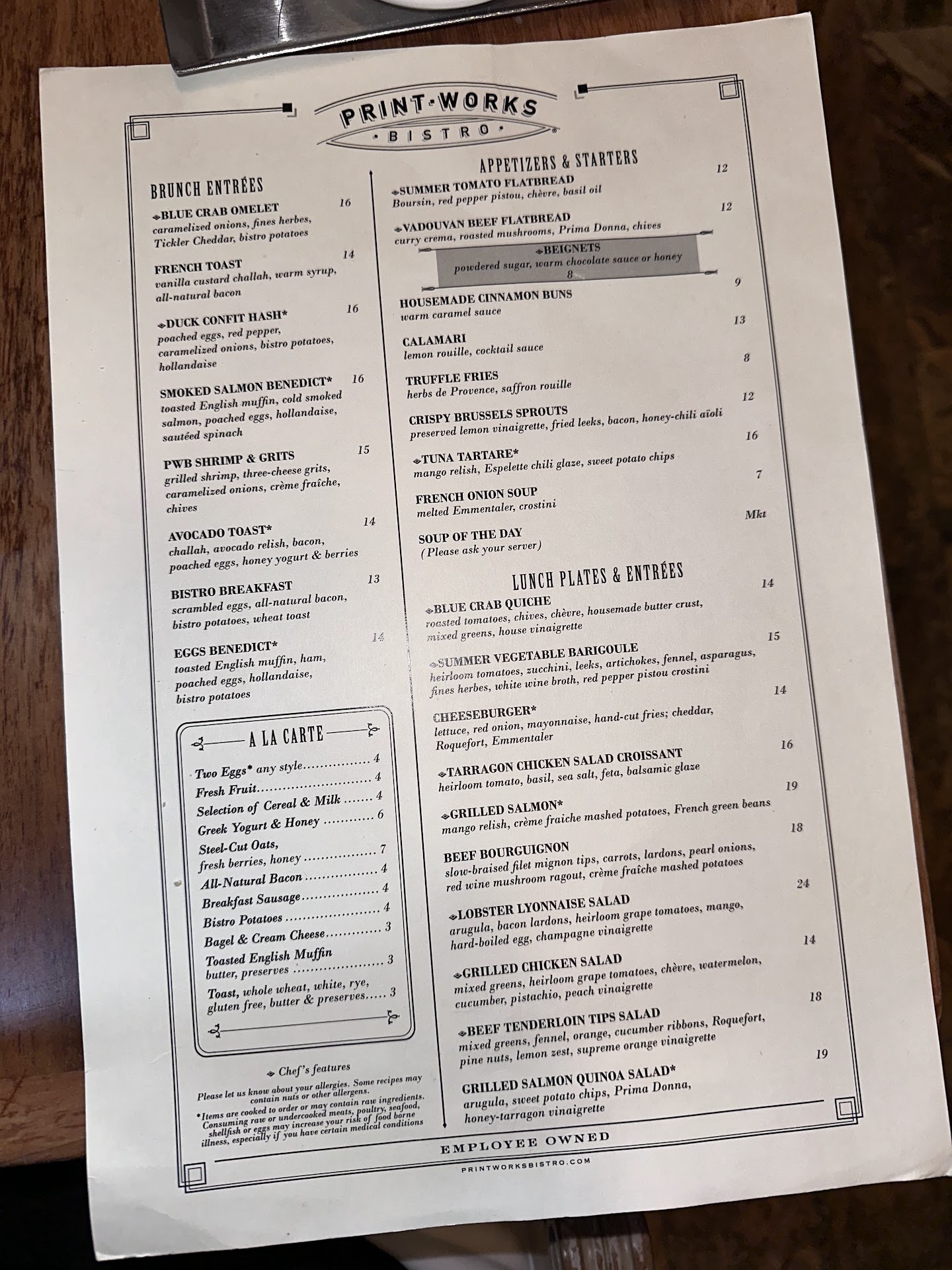 UPDATE 8-13-24 Another year of being happily married, adds up to 19 years and counting. We chose Print Works Bistro for their weekday brunch. As soon as you walk in the door, they treat you like royalty. There were several welcoming faces and friendly chatter. It was raining so our patio reservation moved inside. However, they sat us at a table for 2 right at the doors of the patio. Perfect! Ally was fantastic, friendly, knowledgeable and very prompt. She didn’t rush us but she didn’t make us feel forgotten either. We started with a Mimosa and a Screwdriver. Ally offered the bread service so of course we said SURE! The bread was warm and wonderful but let me tell you, their butter hits different. It is salty and extra creamy. When Ally tried to clear away our bread plates, I latched on to mine and said I was saving my leftover butter for my French Toast. She laughed and said she’d bring me some fresh butter. We couldn’t resist the Vadouvan Beef Flatbread as an appetizer. We planned to take some home but the crust was thin and light and before we knew it, it was gone. Delish! Hubs got the Smoked Salmon Benedict with a side of Bistro Potatoes. I tasted both and they were very good. PWB’s French Toast is extra special. It is thick cut, vanilla custard challah, griddled to perfection, crispy on the outside, tender on the inside and not soggy. It came with a side of warm maple syrup and 3 pieces of crispy bacon and of course my extra butter. We were stuffed! Then Ally surprised us with complimentary Profiterole Ice Cream Sandwiches. We demolished those too. It would’ve been rude not to. Thank you Ally and Chefs, we enjoyed everything immensely!