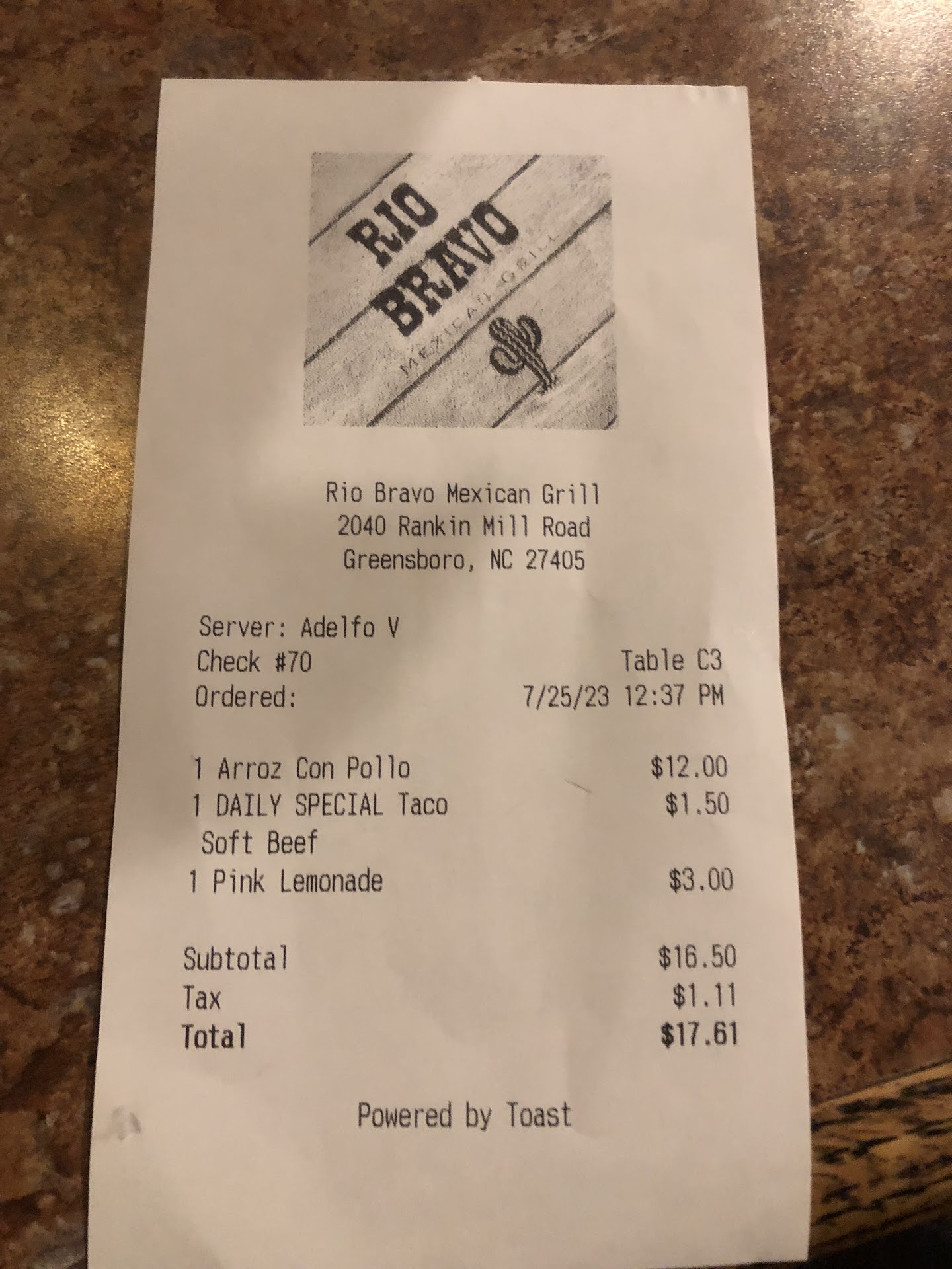 Read moreTypically do not write reviews however I feel as though this place deserves one….. My family and I ordered delivery from Rio Bravo Mexican Grill. We eat mexican food usually a couple times a week but have never eaten from this particular one probably because we rarely go to Greensboro. I wanted to try a new place and we are so glad we did! Our food was amazing! Definitely made the list for top fave restaurants. If the food is this good with delivery(30 minutes away) I can only imagine how good the food is to go in and eat it. I ordered chicken/steak fajitas and although it was just a single order it was by far enough food for two, possibly even three and they were awesome! We also had nachos, my husband said were very good, beef hard shell tacos we all tried (we always have to try a taco at a new place) that were some of the best I have eaten, Rio dip that was excellent. Salsa is great. Literally everything was delicious! Awesome job Rio Bravo!