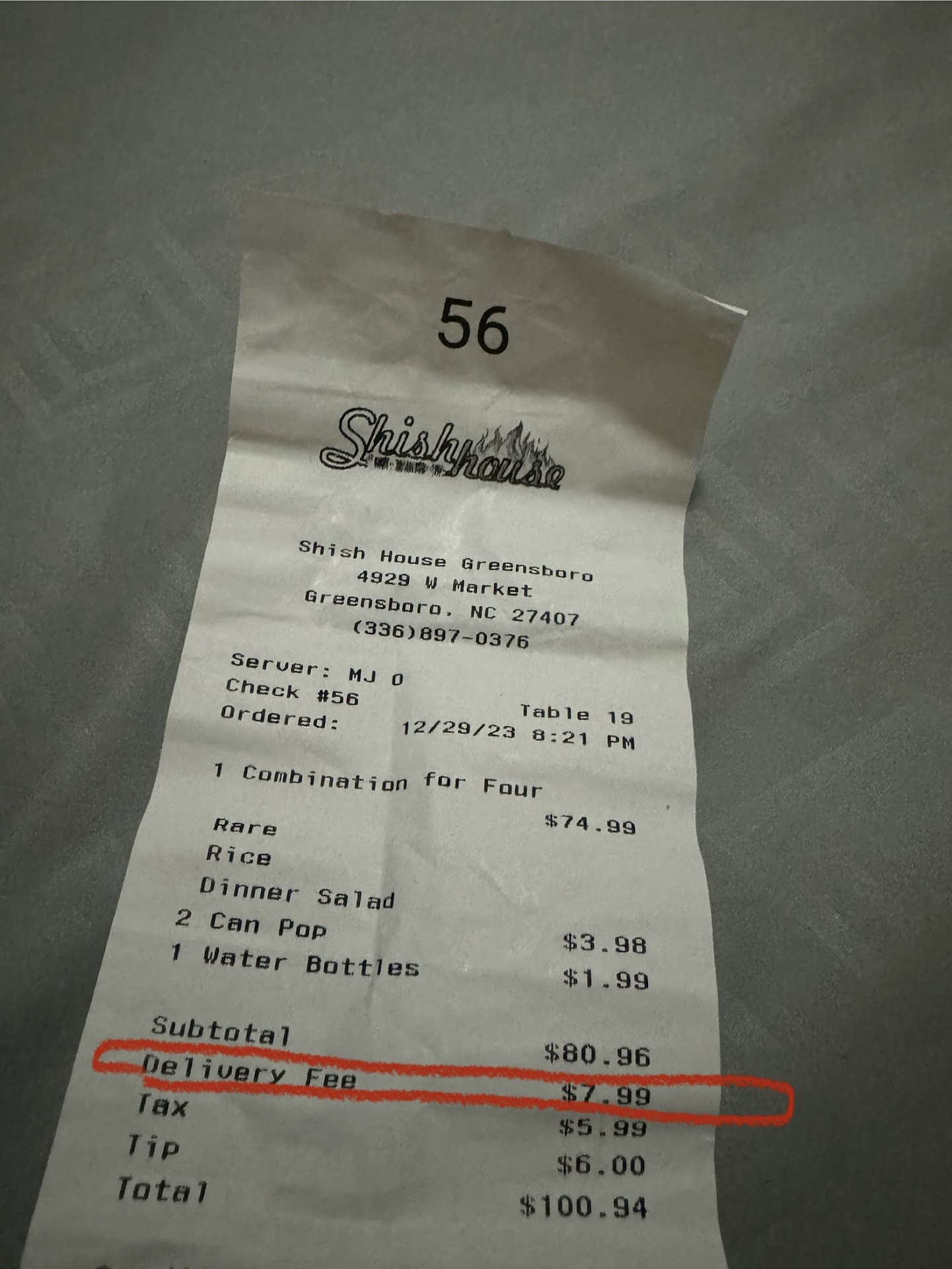Read moreTime will tell… It has been a really long day. My flight was delayed so my dinner choices were thin. I arrived to Shish House a few minutes after 9. The door says they are open until 10. Once inside, the hostess informed me that they were only doing orders for carry out. Strike one, why not say that on the door? So, I browsed the menu, placed an order for just under $50 (with the tip), paid and waited. While waiting, I asked for a cup of water, was informed that they only have bottled water for sale. After spending almost $50, I thought maybe a cup of water was not too much to ask, or a bottle of water for that matter… Strike two?