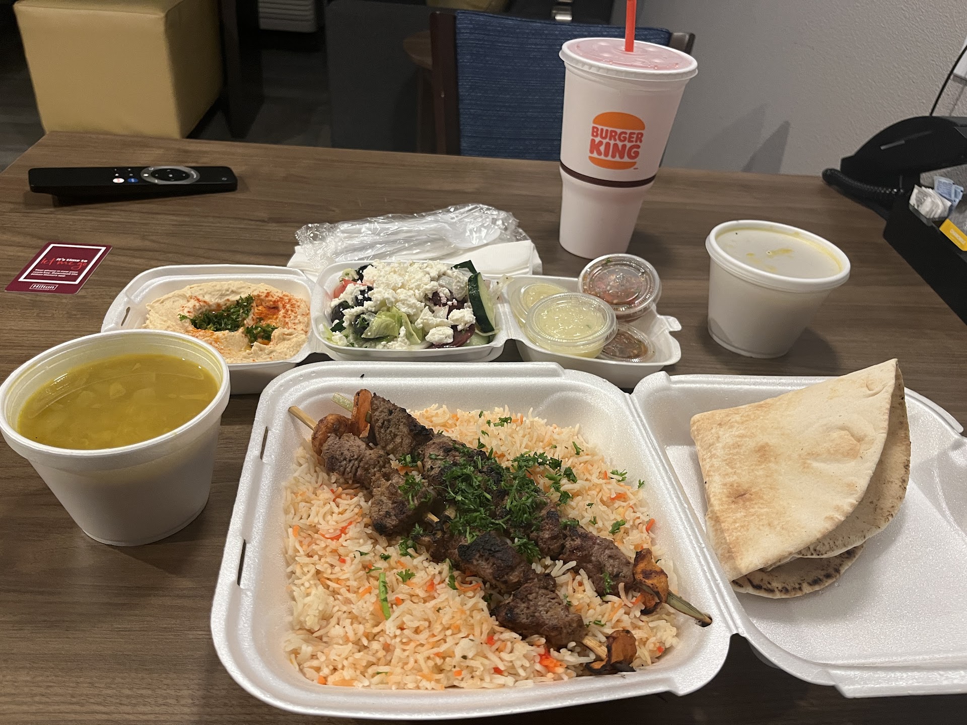 I will get some photos and opinions on the phone when I get back to the hotel. At the moment. Not too pleased. Ok the food was good. It probably would have been great if I had consumed it in the restaurant. The lamb kabobs were tender and flavorful. The rice has a nice hint of seasoning. The hummus is good and a large portion for a half order. I upgraded to the Greek salad and it was great too. Oh yeah, shout out to BK for a...