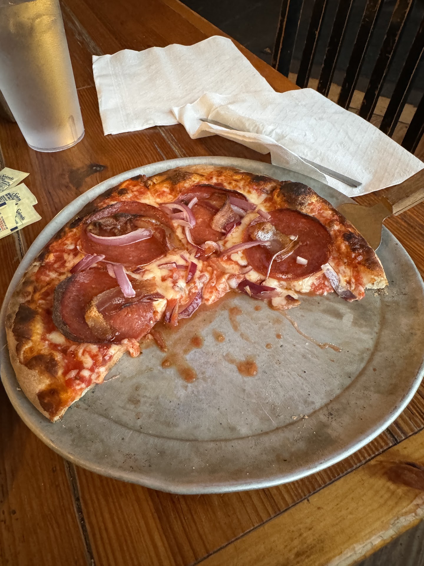 Read moreVisiting Greensboro, North Carolina for some consulting work. Was craving pizza and looking for a ma & pa pizza establishment. Started off with the “Heartbreaker” salad, which is their version of a Caesar salad. The dressing was pretty decent, but the Romain lettuce was soft and a little soggy for my taste. Not overly impressed with it, but it definitely wasn’t the worst I’ve ever had. I ordered a small “tell me how you like it” pizza with Giacomo’s pepperoni, hickory smoked bacon and red onion. I asked for the sauce to be a little heavier than normal. The Pizza arrived about 10 or so minutes later, which was pretty quick in my opinion using a clay fired oven. At first look, it was pleasing to the eye, but that’s pretty much where it stopped. When I pulled the first piece of pizza out, I noticed right away that the crust was soggy about 75% through it from the middle to the outside edge. I think it needed to sit in the oven a few minutes longer. That pretty much killed the pizza for me as I like my crust to be a little stiffer all the way through. The pepperoni was one large piece on each slice of pizza and also 1/2 slice of bacon across each piece. The two meat toppings weren’t half bad and that was the saving grace of the Pizza. The sauce reminded me more of spaghetti sauce due to the moisture of it. It really thinned it out, and wasn’t as flavorful as I was expecting. Overall, the pizza was OK and I did eat all of it minus the soggy crust. It definitely filled the void in my tummy, but I will likely not be a repeat customer based upon this food experience. The service was good by Josh and the place overall seemed to be clean even though I did have a dead fly on my table that I flicked off onto the floor. Lots of potential for improvement in my opinion. I travel a lot and eat a lot of places like this so I may be...