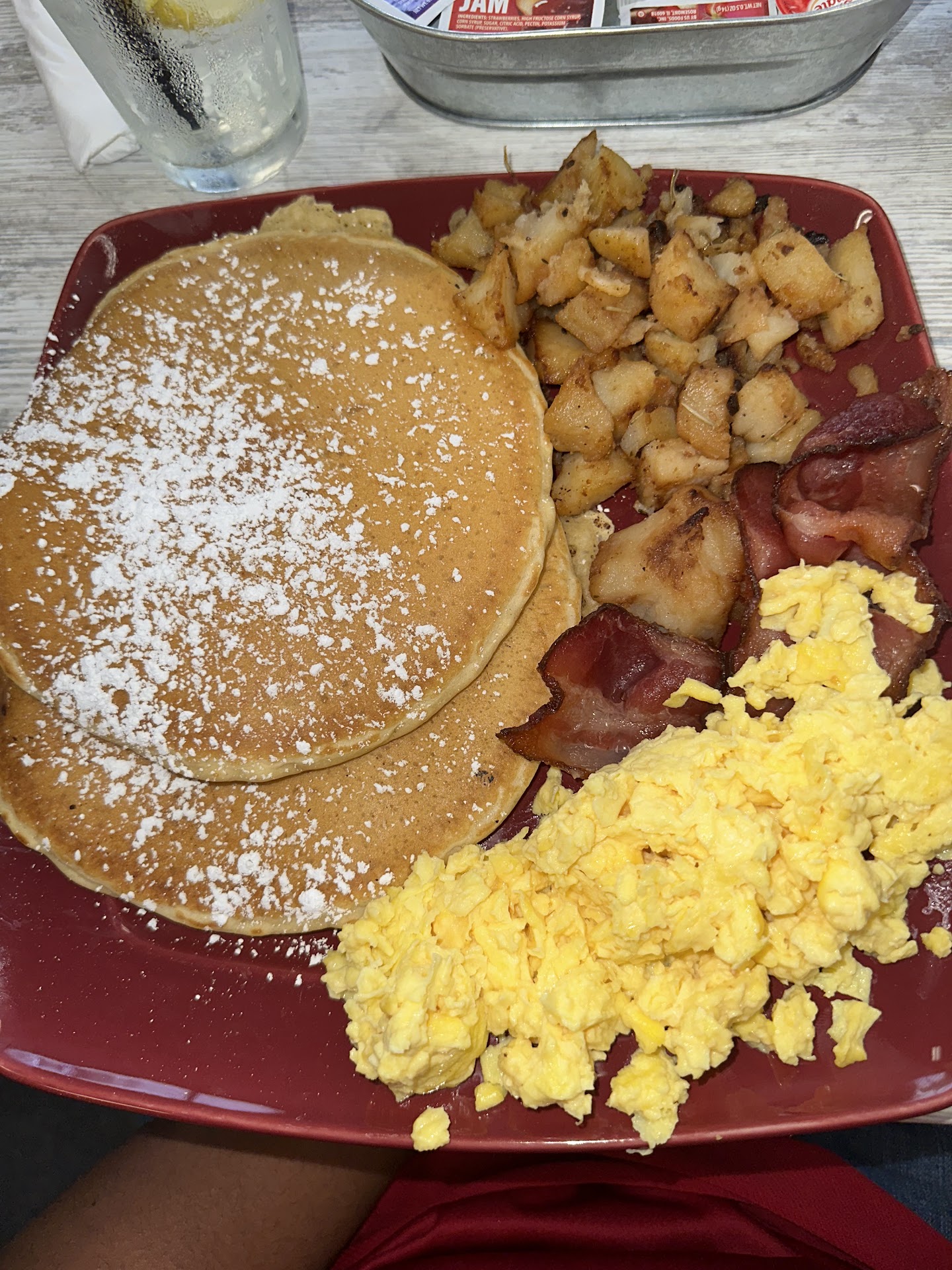 The food came at 12:49pm, which was very quick. The seasoned potatoes wasn’t seasoned enough for me and they were cold. The bacon had mixed consistency with some pieces being crispy (as I like) while others being more soft/chewy. The pancakes were HUGE and the appropriate temperature. The eggs were average. My son enjoyed his food.