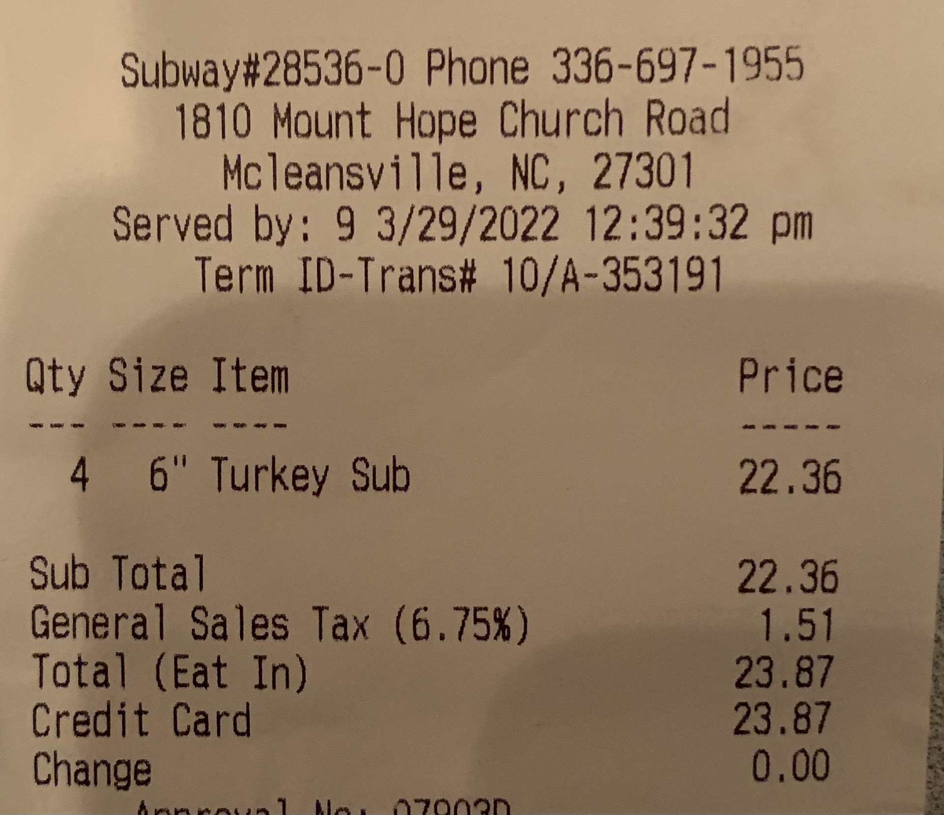 Happened to be coming back the same way, just got around Greensboro and still got a family of 4 to feed, completely forgot about the previous experience at this location. Ordered 2 foot-long turkey on wheat with spinach, tomato and ranch, nothing fancy. We asked âcould you cut them in half?â. âNo problemâ says the nice trainee but then the miserable old lady from the previous decade shows up and says âno thatâs 4 sandwichesâ. Fair enough, but then the bill before tax is over $22? Thatâs $5.50 per sub which is way over what you should pay for 4 basic 6-inch never mind 2 foot longs. Will be filing a formal complaint with Corporate.