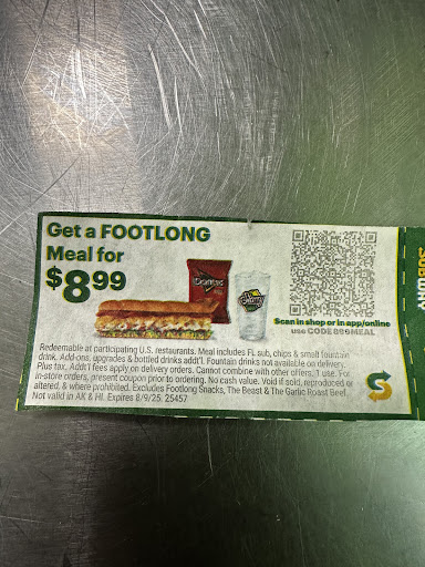 Read moreI've never gone through a Subway drive-thru out of worry of this exact type of thing. The guy at the speaker didn't seem to understand what we were asking for, so we rolled up to the window. Same sandwich I've gotten almost every time at any subway I've been to, and this one is horrible. Asked for provolone, got shredded Monterey cheddar. Asked for sandwich to be toasted with light bell peppers and onions. Got a whole onion's worth of raw onions and raw peppers. Asked for light garlic aioli, which comes with the sandwich, and I know most places slather it on thick. And got a mayo-filled sandwich that has so much mayo on it that I've struggled to eat it, even scraping off as much as I can. Told me he didn't have sun chips and then proceeds to hold up sun chips as a chip option... large cup of sweet tea with absolutely no ice and warm as hell.