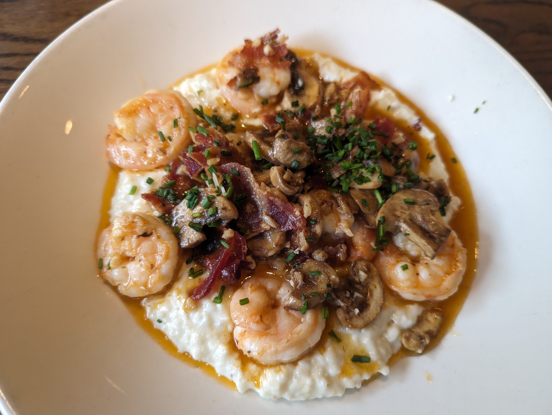 Just as the restaurant is sizeable, so too goes the menu. Apps, soups, sandwiches, salads, entrees, tacos, burgers, and pizzas are all offered here. There are gluten-free and vegetarian options, and you’d be hard-pressed to find something not to your liking. We ended up going with fish and chips and shrimp and grits. The food arrived quickly, and our server was polite and responsive throughout the meal.