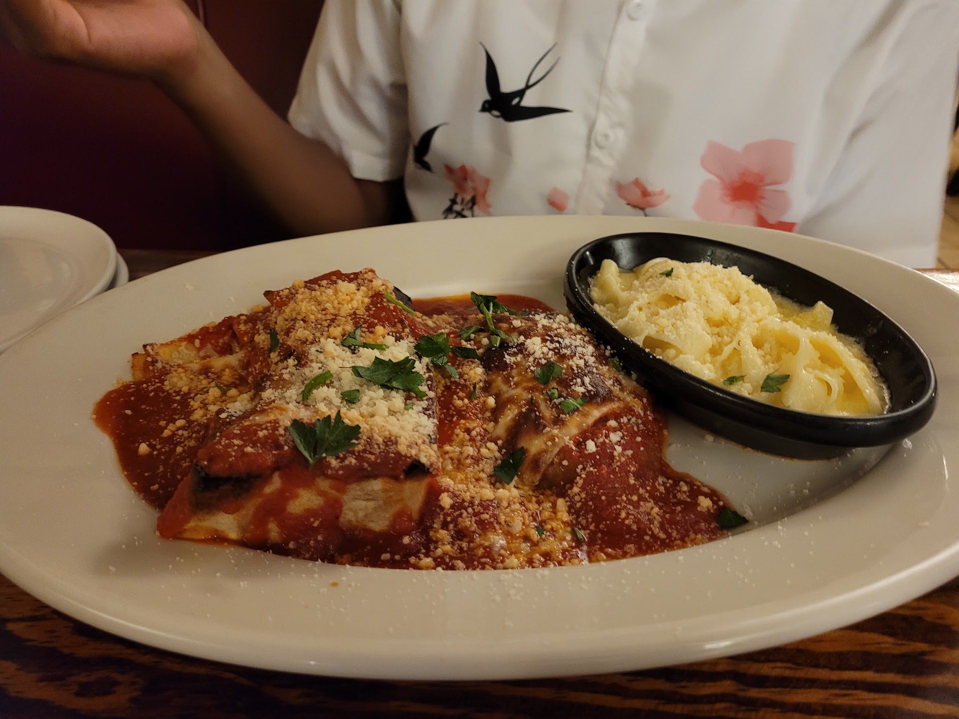 The good: my son had the pasta and meatballs and enjoyed it very much while I tried the Tour of Italy comprised of lasagna, fettuccine Alfredo and veal parmigiana. Nicely baked and very filling. The veal was slightly salty for my taste and that is how I knew that the dishes were not inter mixed since each tomato based sauce had its own flavor.