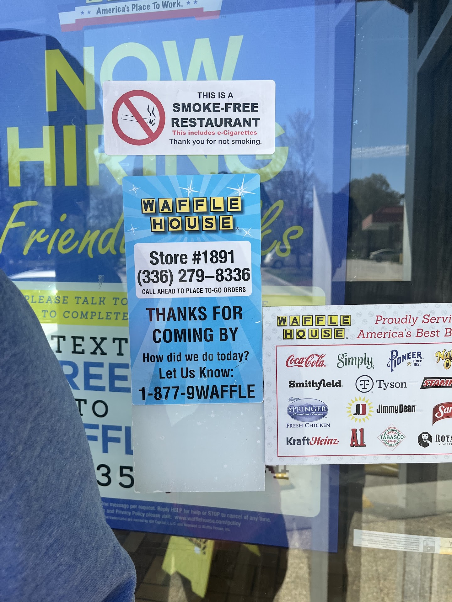 My family just dined at this location. When we walked in there was a sign on the door stating "Do not sit at a Dirty table." But literally everywhere that didn't have a person was dirty. The cleanest table just needed to be wiped down, so we stood by it for a minute waiting for someone to wipe it down. No big deal to wait, we were very patient. However, we then noticed the floors were filthy and looked as if they had not even attempted to sweep from previous diners. There was bacon and waffle bits on the floor, as well as, crumpled up napkins and straw paper everywhere. Usually it's not a big deal for me to overlook a little mess on the floor, but this was an obvious attempt at ignoring the mess. We received plastic ware to eat with, but later saw a couple of other guests get metal ware. I assumed they must have been behind on cleaning, but never saw anyone of the 6 people even begin to wash anything. I noticed at one point one lady started sweeping, but it was in the kitchen area, not anywhere near where it actually needed to be swept.
