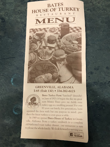 Read moreMy husband was excited to try Bates House of Turkey because one of the things he loves is turkey and dressing. We made the 1 1/2 hour drive up to Greenville so he could have that. We ordered the turkey dinner plate, with dressing, and between us our sides were pineapple casserole, field peas, and sweet potatoes. The sides were pretty decent, but the main thing, the turkey and dressing left a lot to be desired. The turkey was like a thick sliced lunch meat and the dressing.....the dressing was like two scoops of flavorless cornmeal mush with what tasted like some canned gravy poured over the whole thing. We could not determine any celery, onion, sage or any flavoring at all in the dressing except maybe some turkey broth. The price was excellent for the amount of food but in all honesty, I would have rather paid more for better quality on the turkey and dressing. (I need to send them my recipe for the dressing because folks would come in to the restaurant just to get my dressing. haha.) I have talked to several people that have been there in the past and said that it used to be excellent not sure what happened. I would recommend maybe sticking with a turkey...