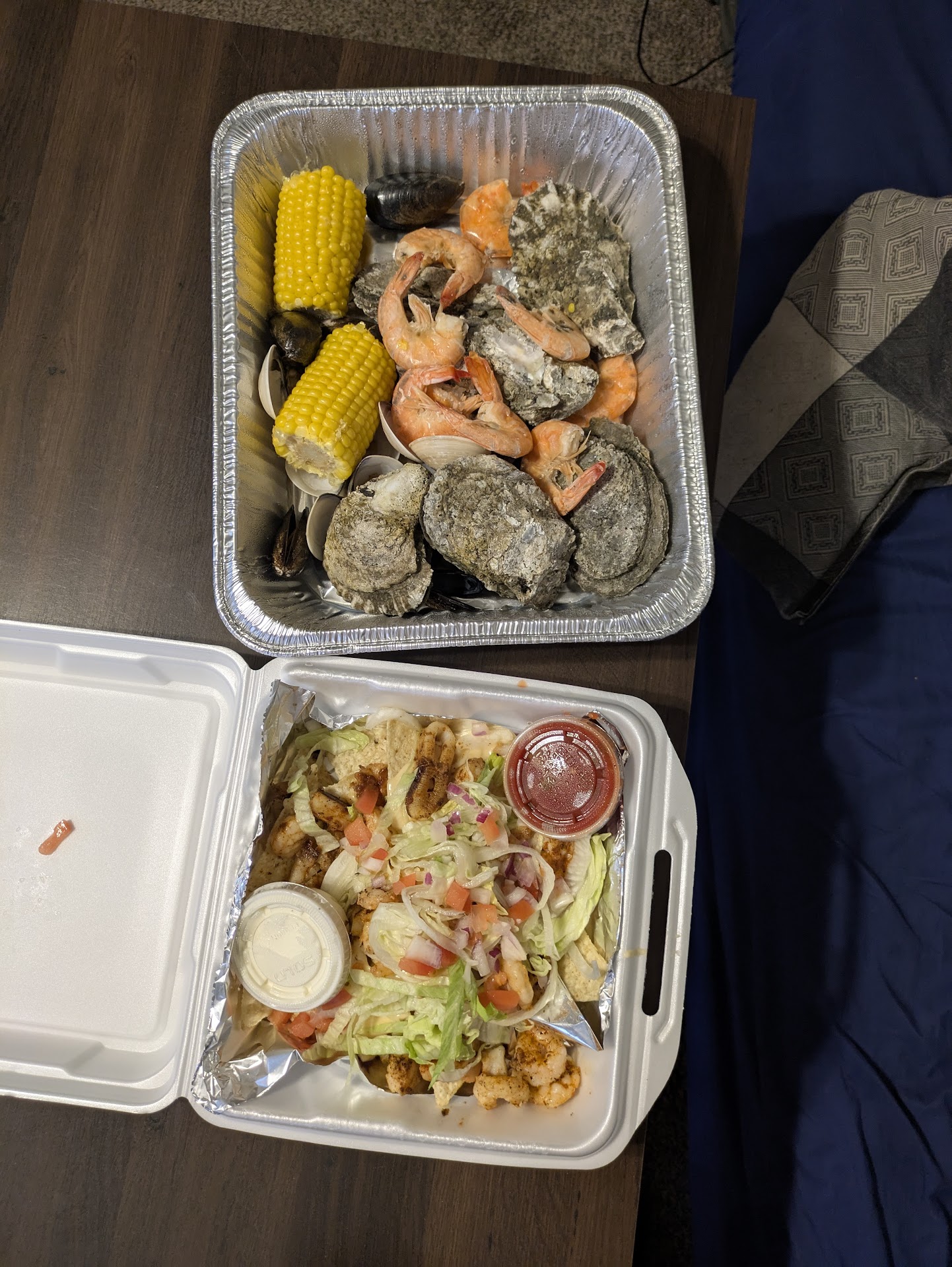 I ordered the 1/4 lb fried shrimp, a dozen of mussels, which were extremely dry not much flavor, it was missing some white wine garlic flavor or something, 6 raw oysters, 6 oysters rockerfellas, 1 crab cluster, the crab legs were so sweet and didnāt need any sauce or butter, a crab cake, and clam stripās appetizers as you can see I am a food critic at itās fullest Teekaaboo Style and donāt play with my seafood. Their hush puppies were good and delicious. They had a great event going on and I enjoyed the guy playing the guitar.