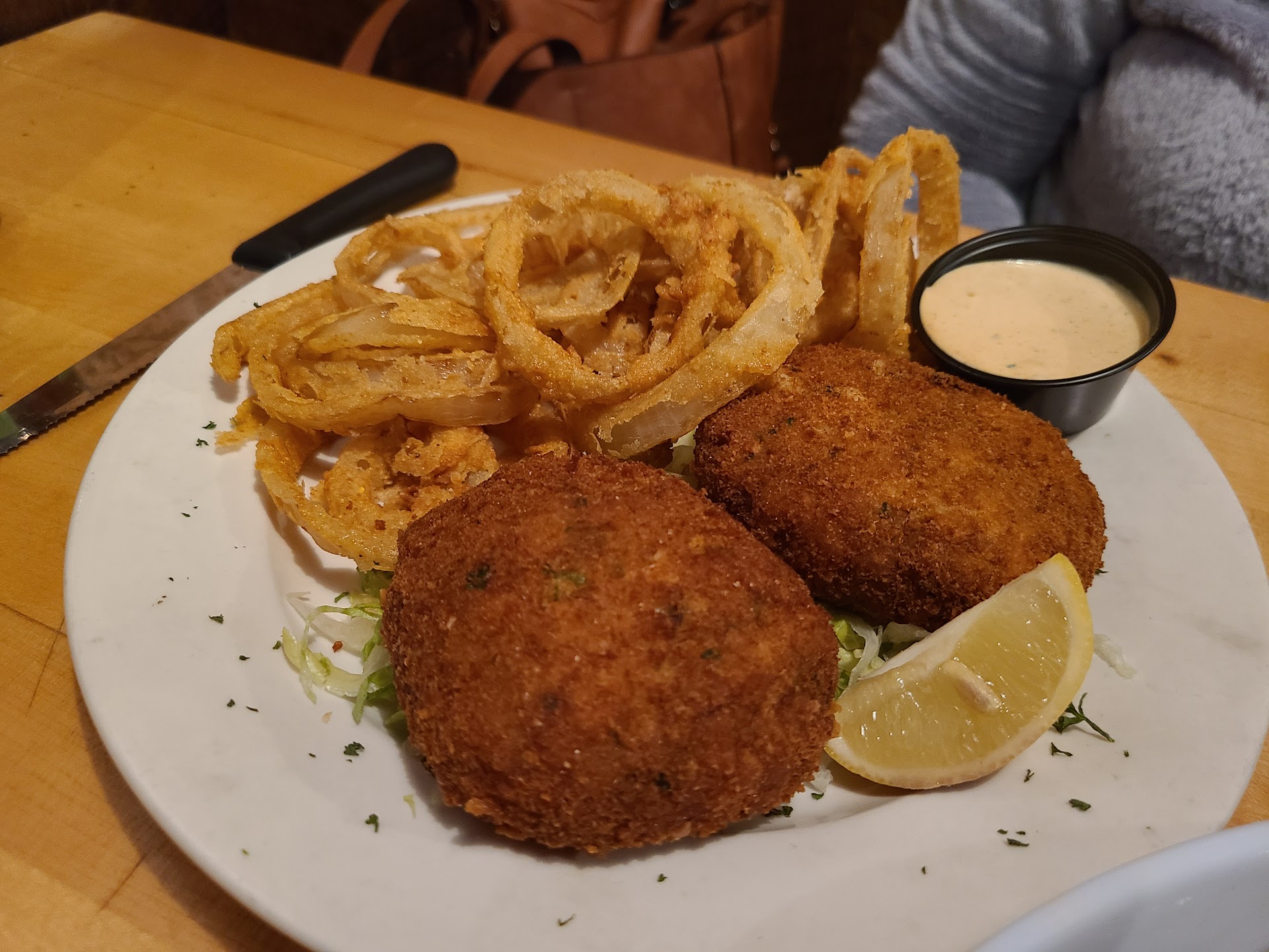 All our food was generally well prepared. The portions were at least generous if not almost excessive. I was full after I finished my salad and half of my salmon and baked potato; I had enough leftovers for dinner the next two nights. My brother-in-law finished his wings and said they were really good. My sister's filet was ordered medium. It was much closer to rare. She called it raw. I encouraged her to send it back but she demurred. She doesn't like to make a fuss. My salmon was basically perfectly prepared.