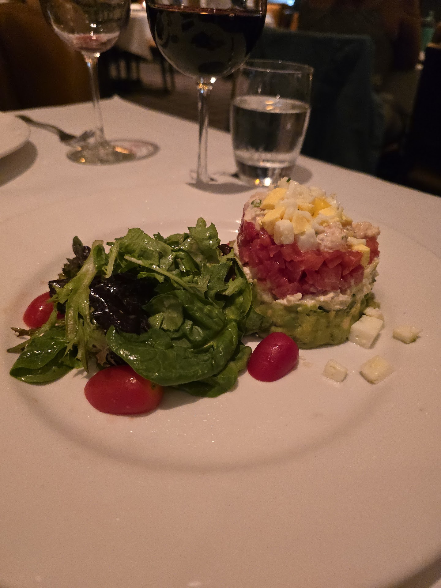For the main course, both wives opted to go light and had the Tuna Tartare ($16) appetizer which was presented as a mini tower with layers of avocado, mango, pine nuts and wontons in addition to the tuna. They both enjoyed the mixture of flavors, and the tuna was sushi grade.