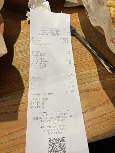 Read moreThere's nothing I hate more than bad service.. which is exactly what I experienced at this Chili's. Some people in the service industry don't understand their jobs depends on giving good service and it disgusts me this waiter still got a bigger tip than she deserved because we are decent people. I've never been a huge fan of Chili's, but some of my family likes it and the food has definitely gotten better (As long as it doesn't come out lukewarm as ours did this time). I visited another location last week and had a really good experience. But here, we had to ask multiple times for things, drinks were not refilled and service was slow. We left waiting for things we ordered and never received and we were so over the experience by the time our food came that we took it to go. It was either they put it in the microwave in the back to make things right or we do the same at home.. Either way it gets nuked instead of actually cooked fresh which defeats the purpose of a restaurant. I'm sure I will be forced to endure this Chili's in the future, but I will be sure to remind my family of our horrible past experiences in an effort to choose a better restaurant. I will never return to this Chili's of my own choosing, only when family chooses it and I have no choice but to go or not spend time with family. Do yourself a favor and visit El Fenix.. or Applebee's if you want more than just Mexican food. I see that this Chili's tends to give canned responses to reviews, but the service does not seem to have improved with all the feedback they've received and someone needs to tell them that actions speak louder than words. If you visit and have a bad experience, you can't blame me.....