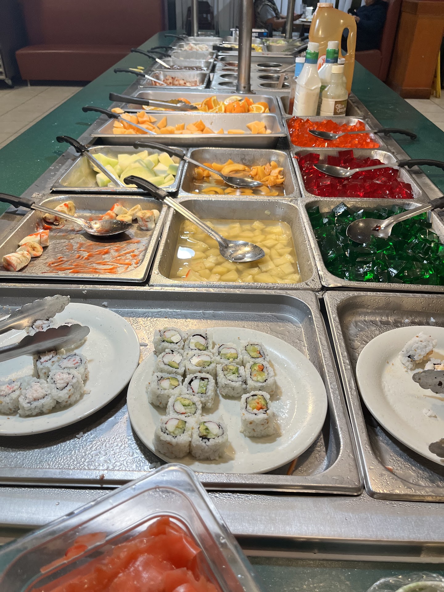 Second, I go to Chinese buffets not only for the all you can eat aspect but also because of the never ending supply of sushi. Now it's a Chinese buffet so my expectations are lowered. Luckily for me I noticed the notes on the sneeze guard that denotes the time each batch was made or put out. Most of the times for the raw foods (sushi, shrimp, mussels) was between 1300 and 1330. I arrived at the restaurant at about 1800. That's a long time for raw protein to be just sitting out.