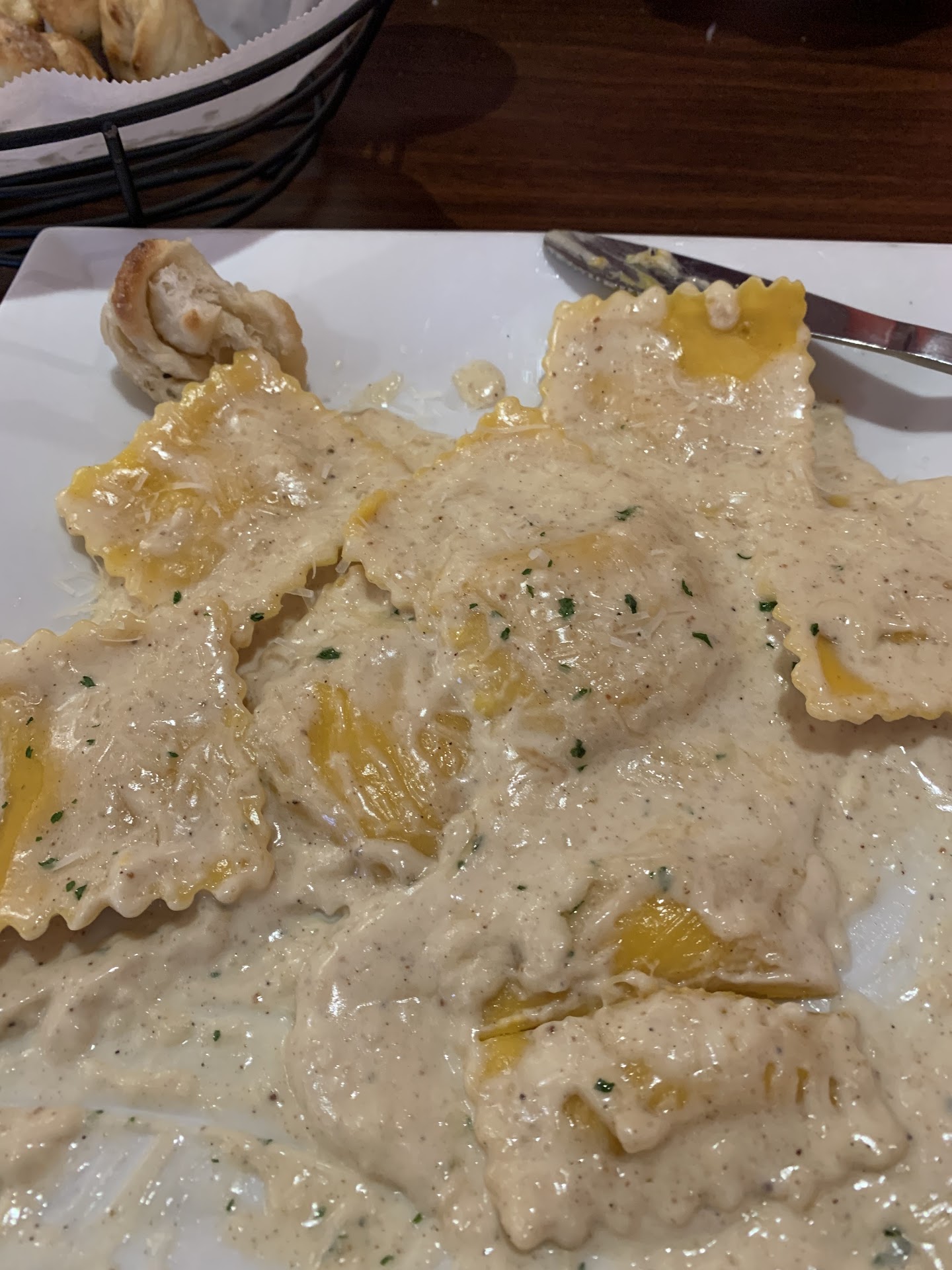 Read moreWe went to this restaurant Saturday night early, around 6:30 PM. We had a young male server who was pleasant enough but not knowledgeable about the menu. We ordered the Seafood fra dievlo and a linguini white clam sauce. We asked the server if one of us could substitute soup for salad, the server had to go ask, he did not know if this would be allowed. He came back a couple minutes later and informed us it would be a $2.00 up charge for the soup. We declined. When we received our salads, we could see why. The 2 house salads were tiny and looked to be yesterday's unused salads. We both ordered blue cheese dressing which was creamy Italian dressing with blue cheese chunks in it being passed off. The bread was hard and was most likely yesterday' s unused bread. While waiting on our meals, I noticed other house salads being brought out that were much larger and fresher looking than ours. I also noticed 2 large plump Cesar salads brought to the table next to us, I asked The server about these salads and he informed me it was $1.00 up charge. Had I known this, I would have gladly spent the $1.00 to get a better salad. The entrees came out and were "okay". Not a whole lot of food, you would think pasta is inexpensive enough that they would not be shy with portion size- this was not the case. We were shown a dessert tray at the end of our meal and asked the server if it was real ricotta cheese in the cannoli and he had no idea. At that point, I was not impressed with the place so I passed on the dessert. I can't say the food was bad but it was $16.00 for the linguini and $19.00 for the Seafood entree which had the salad and bread been better and the portion size of the entrees been better would be ok. The place lacks atmosphere, presence and knowledge. We are from NY so we've been to a lot of Italian pizzerias and spaghetti houses, we were hoping for better. In addition, we were not seated far from the kitchen and heard a lot of joking, laughing and horse play. My advice would be to get some seasoned wait staff who are there to actually make a living, increase portion size, NEVER serve YESTERDAY'S old...
