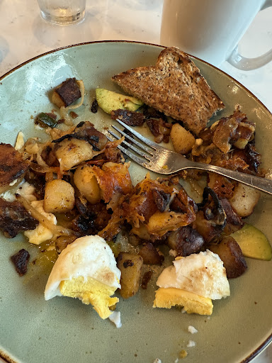 The omelet itself was a delight, packed with ham, bacon, sausage, house-roasted crimini mushrooms, onions, and tomatoes, all topped with all-natural sour cream. The potatoes served alongside were equally delicious, though I was disappointed to learn they were out of the Bob's Red Mill Buttered Grits, which I had been eager to try.